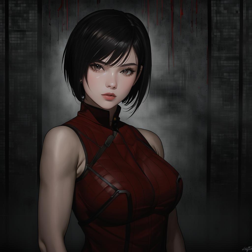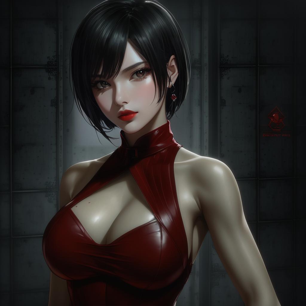 Ada wong, resident evil, 1girl, lips, brown eyes, short hair, black hair, bob cut, medium breasts, large breasts, red dress, by artist kuena, animagine