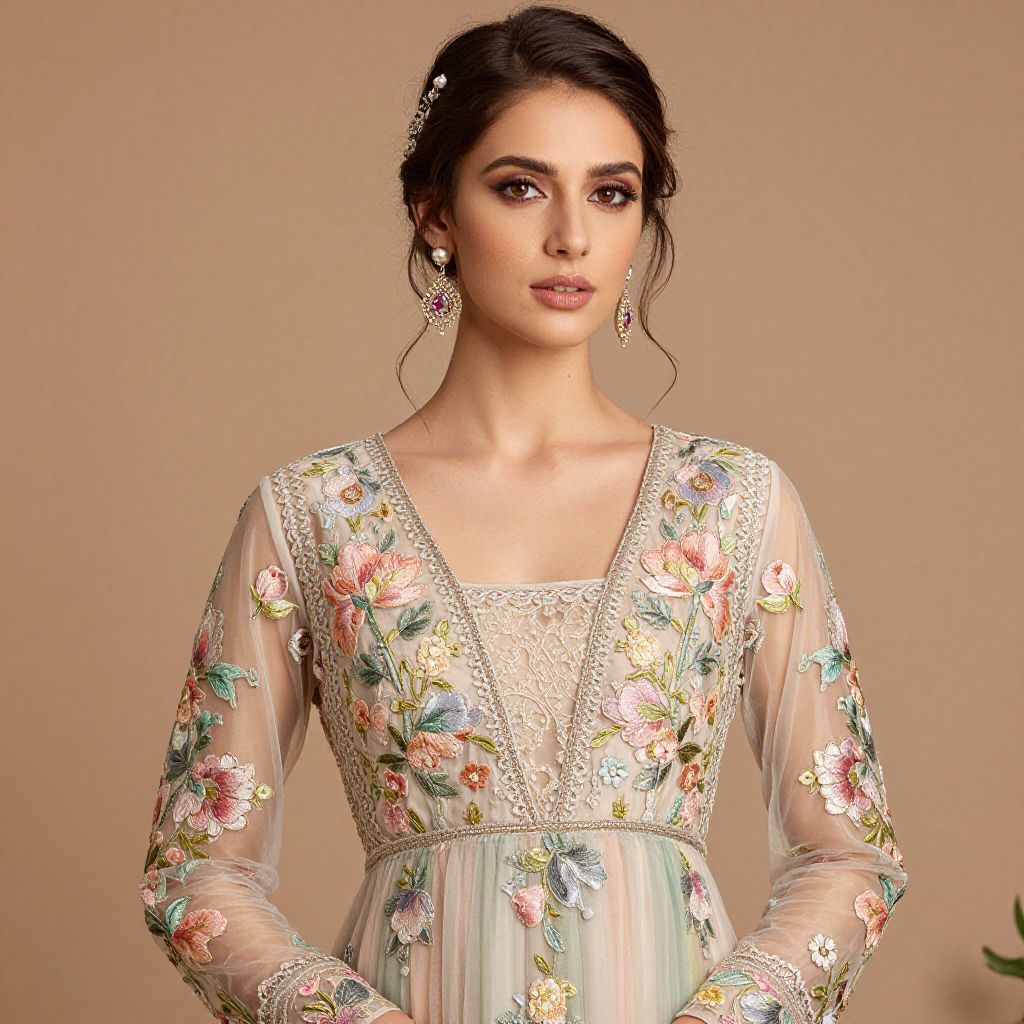 A poised woman wearing an elegant floral gown with intricate embroidery and sheer sleeves, styled with delicate earrings and hair accessories. The soft pastel colors and detailed craftsmanship highlight a sophisticated and refined fashion aesthetic.