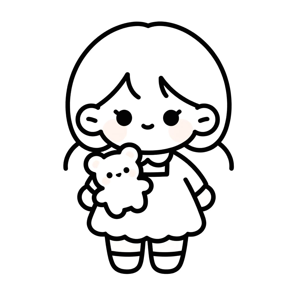 Black and white line drawing of a cute, chibi-style girl with round eyes, holding a small bear, wearing a dress. Simple, minimalist design