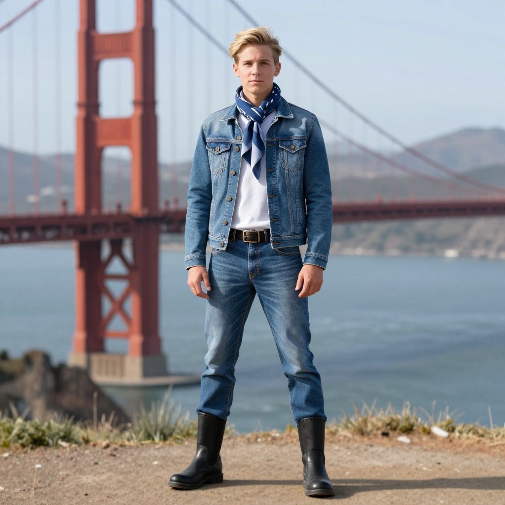 Photograph of a blond, Caucasian man standing confidently in front of the Golden Gate Bridge. He wears a blue denim jacket over a white shirt, a blue and white striped scarf, blue jeans, and black boots. The bridge's red towers and cables are in the background, with a blue sea and hilly landscape visible further back. The man has a serious expression, his hands by his sides, and stands on a grassy, dirt path. The lighting is bright, highlighting his stylish, casual attire.