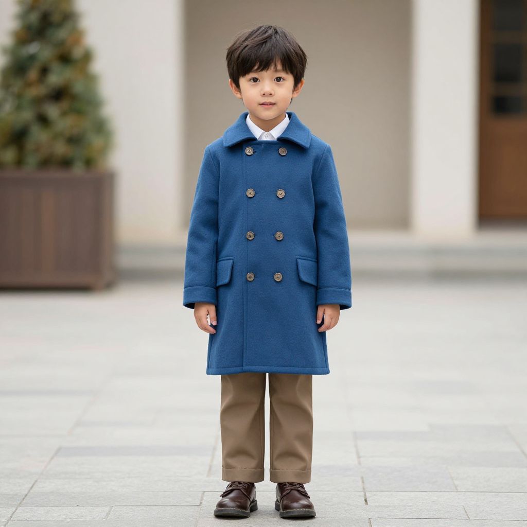 Kid Coat Costume, image of a little boy in a blue coat and brown pants
