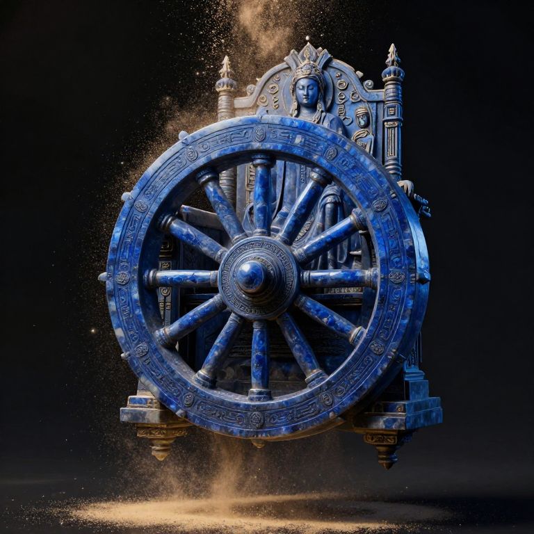 Photorealistic digital artwork of an ornate, blue, ancient-style chariot wheel with intricate carvings, surrounded by dust, against a dark