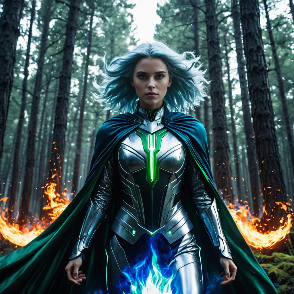 A young Caucasian woman depicted as a futuristic hero standing in a dense forest. She has blue and green glowing hair styled in a large, fiery wig and wears a shimmering silver armor with glowing green accents. A flowing dark blue cape extends behind her, contrasting with the orange flames nearby. The scene is highly detailed with cinematic lighting, highlighting her intense gaze and slim silhouette.