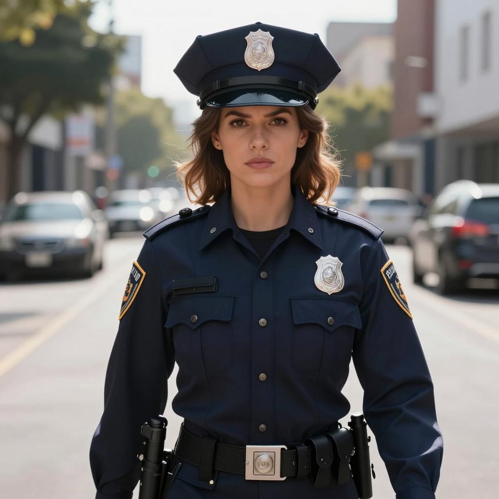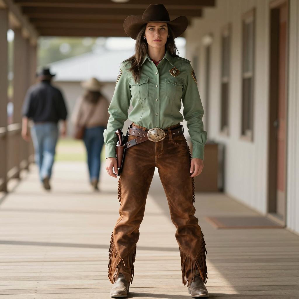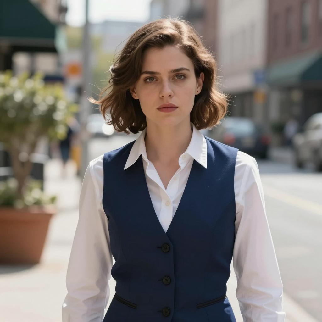 Jane breaking bad costume, photograph of a woman standing in a narrow, sunlit urban alleyway, wearing glasses, brown jacket, pink button-up shirt, dark brown pants, black belt, hands in pockets, serious expression, neutral background with tall buildings, realistic style, slightly blurred background, daytime, soft light, casual attire, modern urban setting, centered composition, full body shot