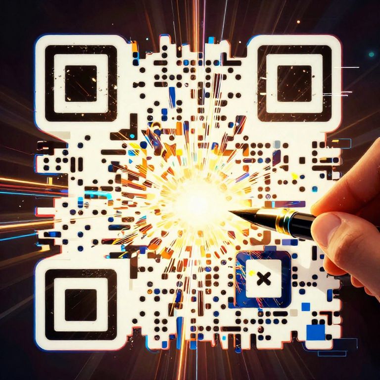 A vibrant photograph depicts a digital QR code explosion with bright white, black, and blue squares amidst a burst of radiant yellow and white light. The explosion radiates outward from the center, surrounded by dark, star-like specks. A human hand, with light skin and short nails, is visible on the right, touching the QR code. The background is dark, emphasizing the luminous burst and the QR code's intricate, fragmented design. The image combines elements of digital art and photography, creating a dynamic, futuristic visual effect.