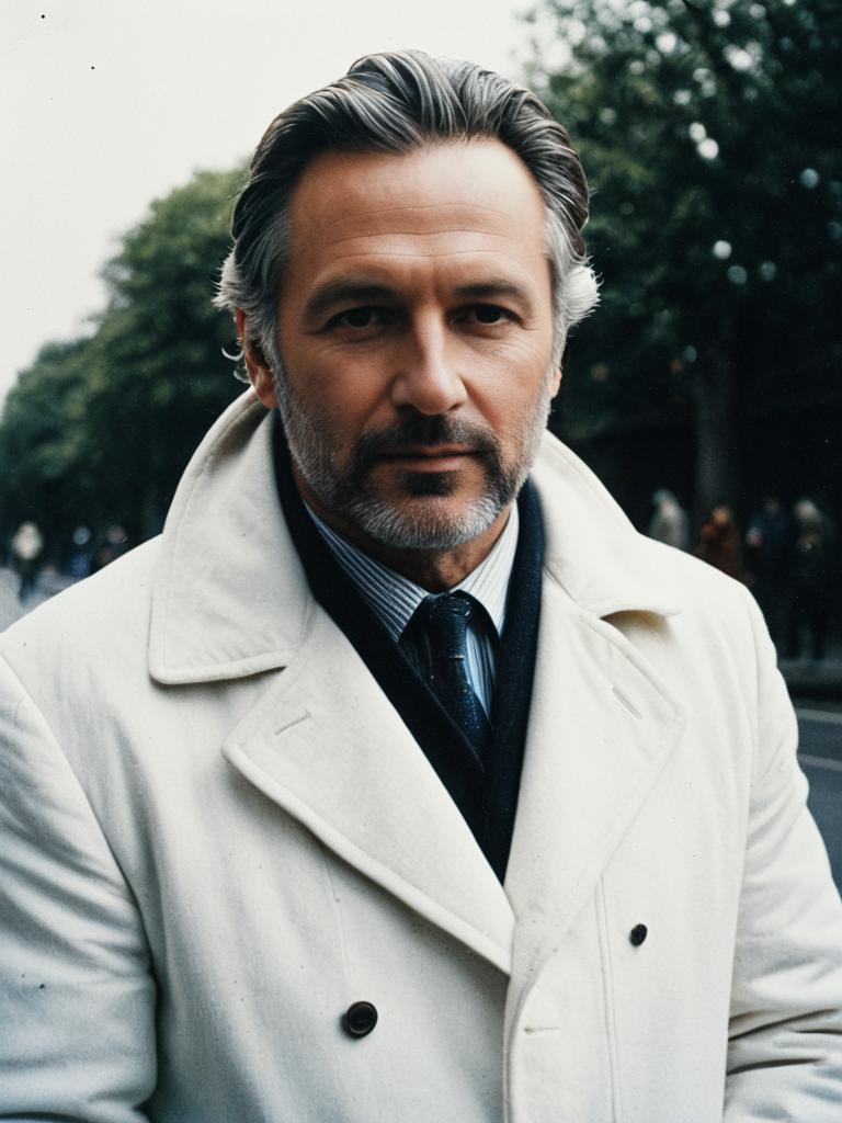 Man in White Coat, photorealistic outdoor portrait, daylight