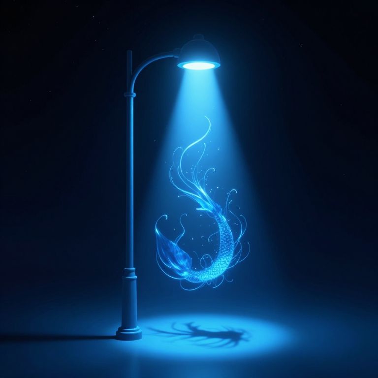 Photograph of a blue-lit street lamp illuminating a glowing, ethereal fish with intricate, swirling fins in a dark background.