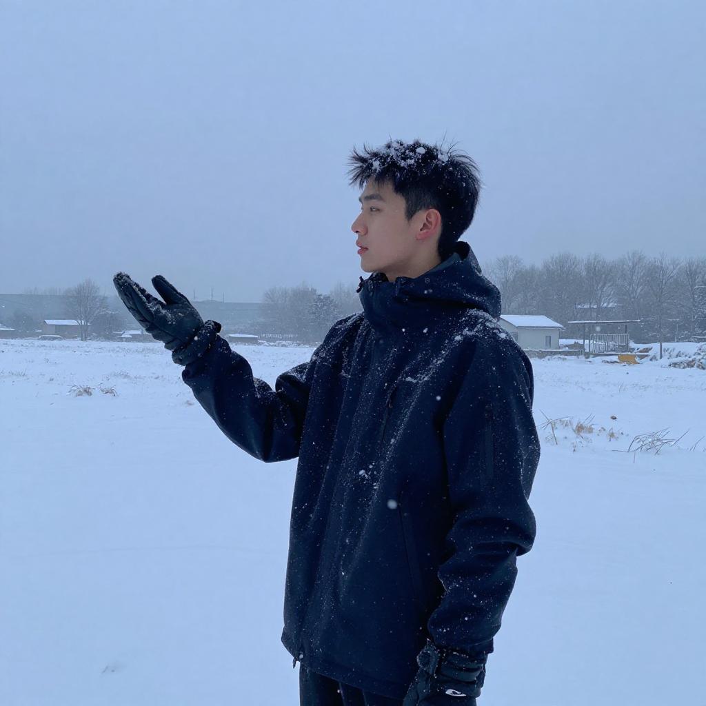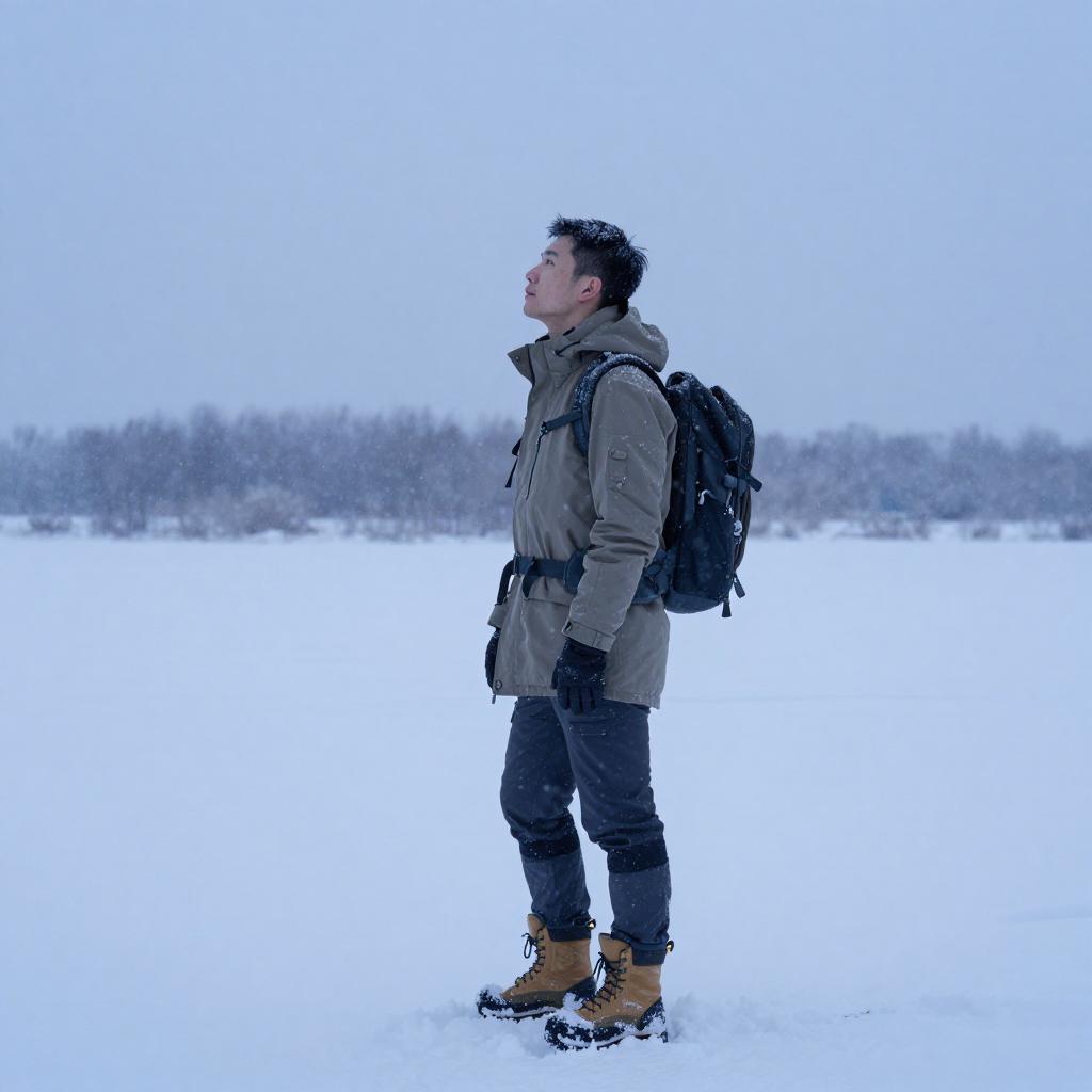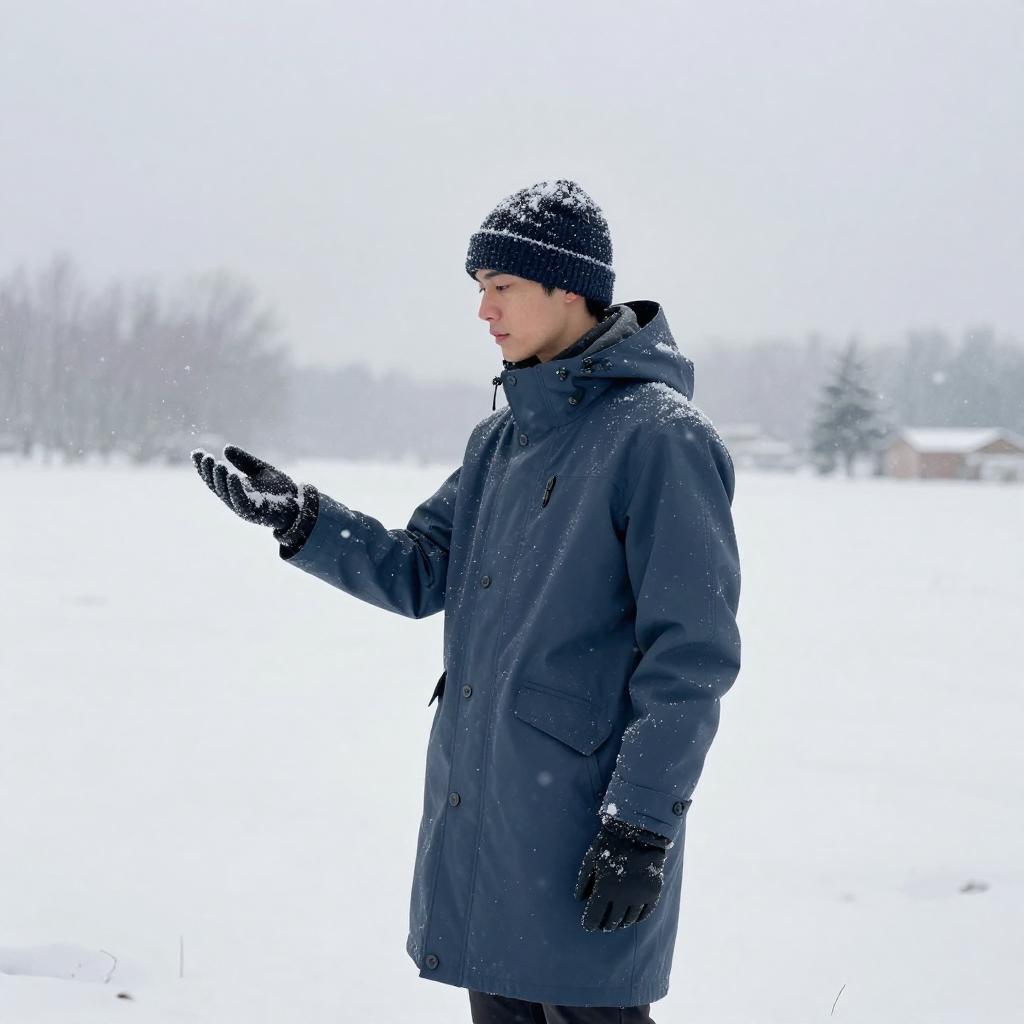 Youthful man, snowflakes gently falling, soft white snow covering the landscape, early morning snowy forest, tranquil and serene atmosphere, pale blue with hints of gray, the man dressed in a fleece-lined jacket with knit scarf, standing amid a snowy expanse, 4K ultra-detailed, capturing the essence of winter tranquility and the beauty of nature's wintry touch