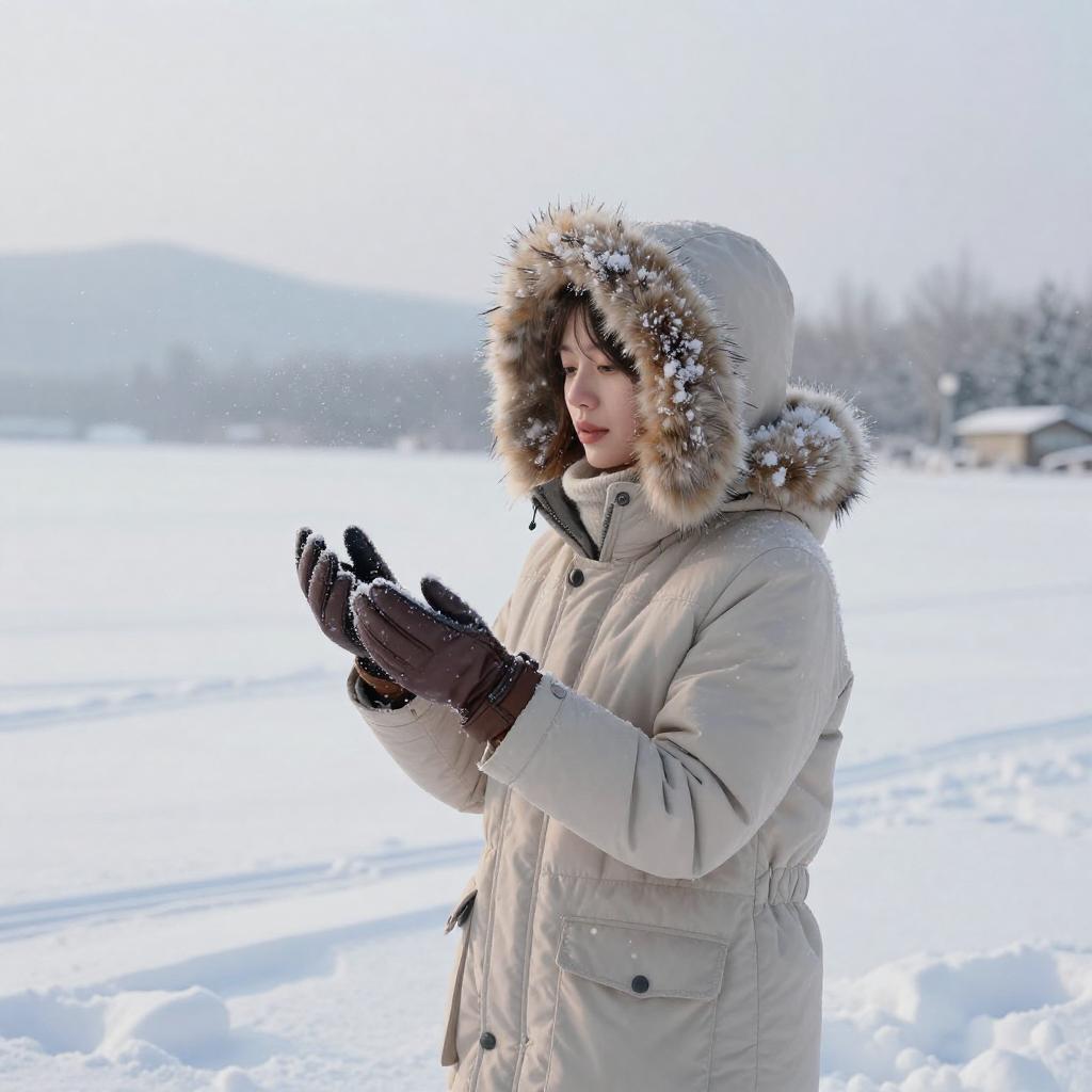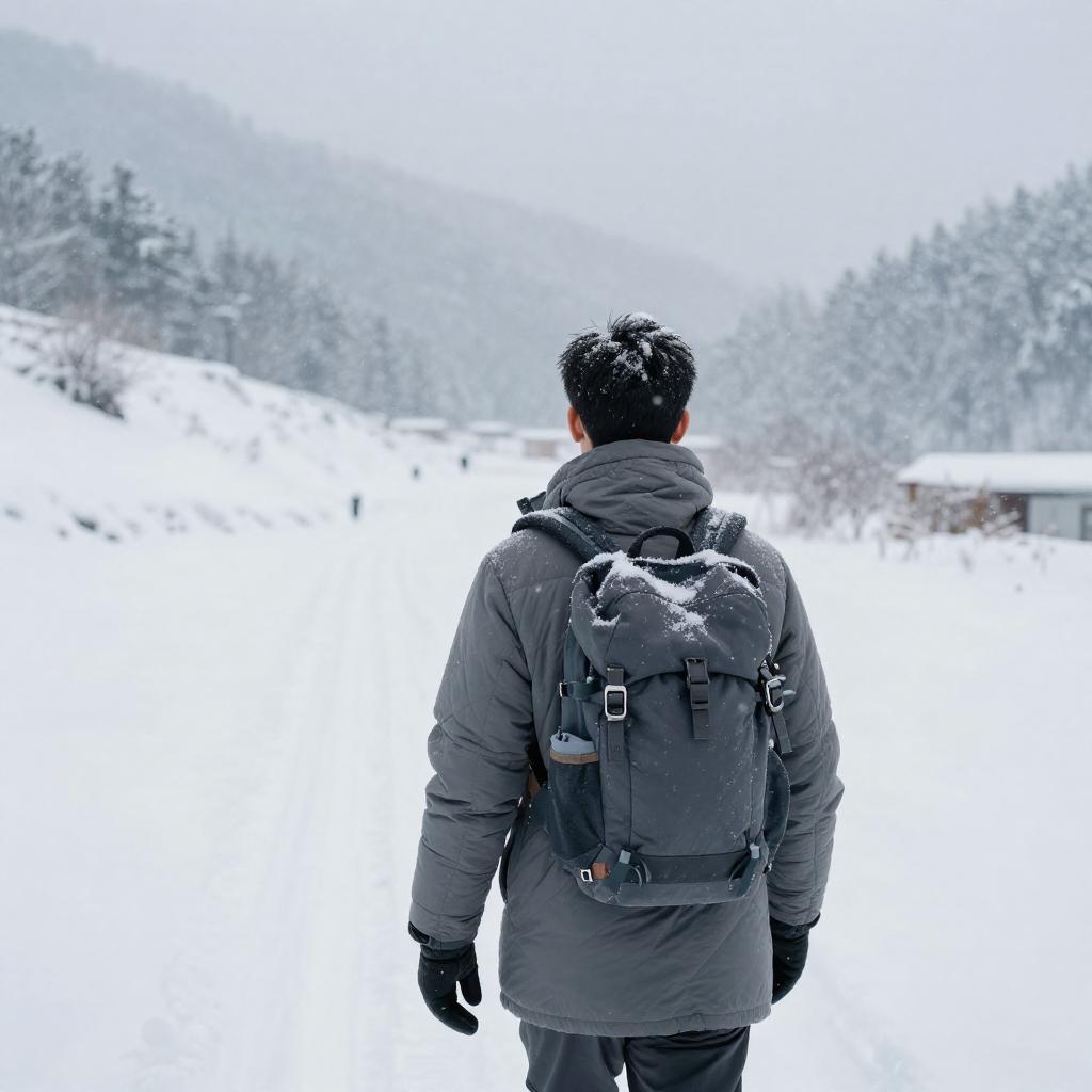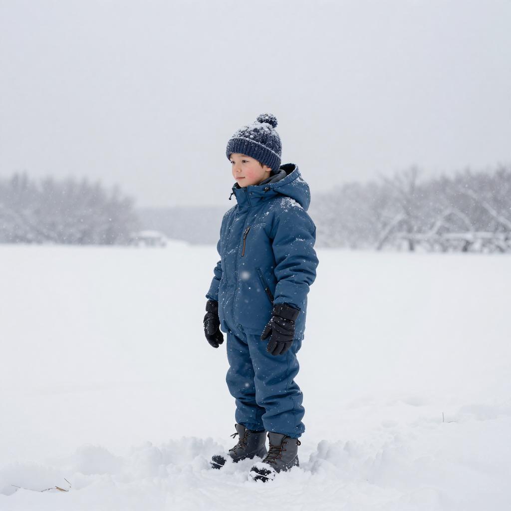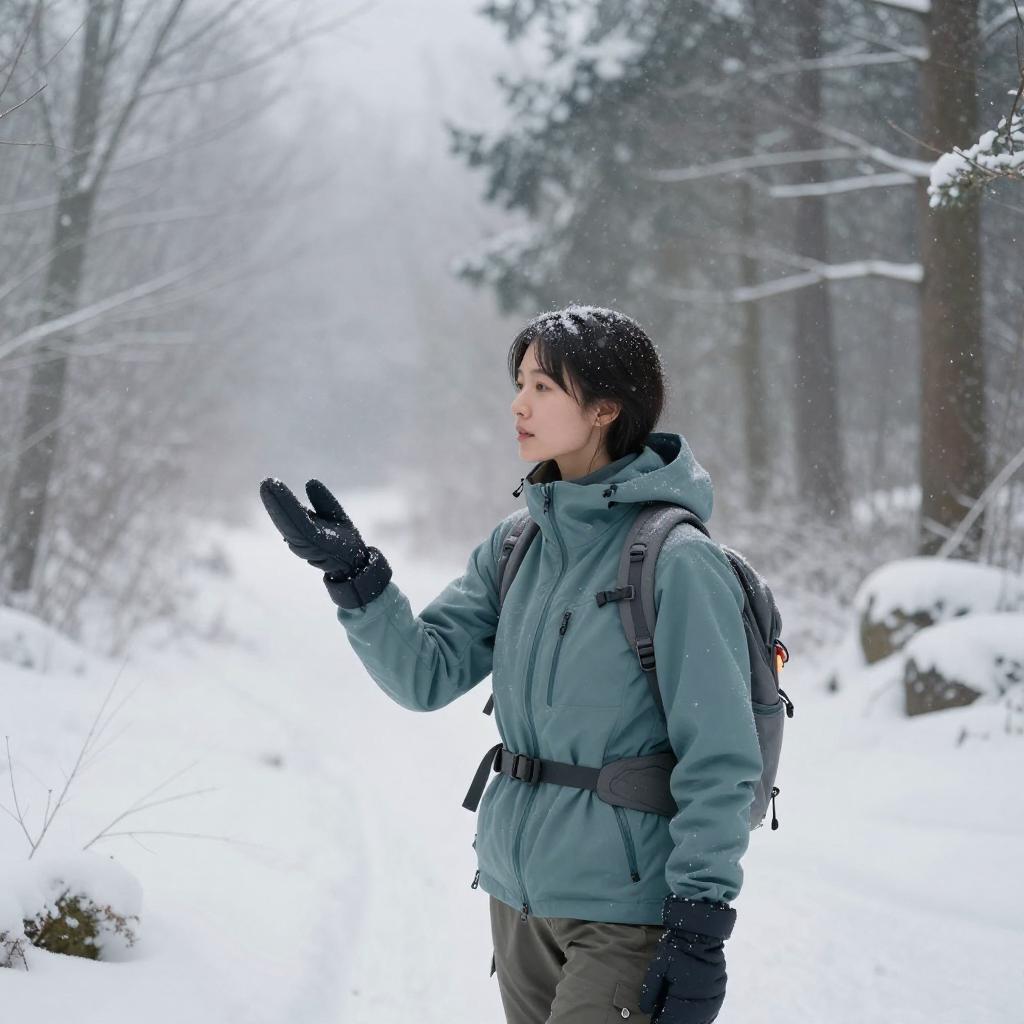 Youthful man, snowflakes gently falling, soft white snow covering the landscape, early morning snowy forest, tranquil and serene atmosphere, pale blue with hints of gray, the man dressed in a fleece-lined jacket with knit scarf, standing amid a snowy expanse, 4K ultra-detailed, capturing the essence of winter tranquility and the beauty of nature's wintry touch
