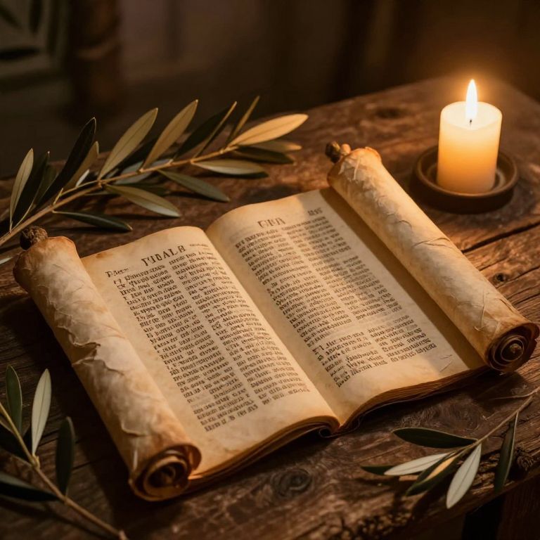 Psalms scene depicting an ancient scroll illuminated by candlelight, surrounded by olive branches and rustic wooden textures, evoking a serene and sacred biblical atmosphere in warm golden hues.