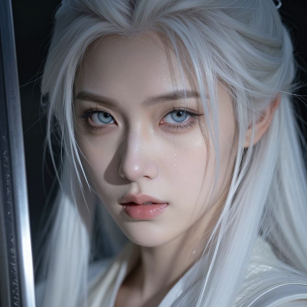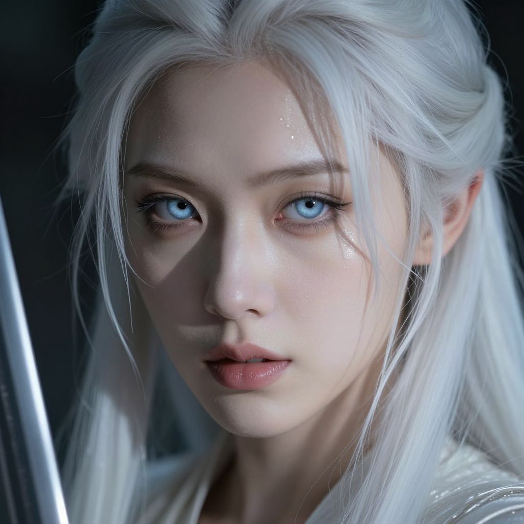 A stunning, hyper-realistic close-up captures the face of a beautiful elven swordswoman, poised for battle, Her intense, beautiful pale blue eyes reflect a fierce resolve, shining with both quiet strength and an underlying vulnerability, The sharp, delicate features of her face are framed by long, sleek white hair, slightly tousled, with strands falling over one eye, adding to her mysterious allure, Her expression is a mesmerizing mix of determination and fragility, capturing the duality of a warrior ready to fight yet imbued with an ethereal, almost otherworldly beauty, Soft beads of sweat cling to her flawless, pale skin, subtly glowing in the dramatic side lighting that enhances every detail, The lighting casts intricate shadows across her face, highlighting the contours of her high cheekbones and the softness of her lips, which tremble slightly with tension, There’s a moody, atmospheric glow surrounding her, blending the ethereal elements of a fantasy world with the timeless elegance of modern fashion, Her gaze is piercing yet distant, as if contemplating both the battle before her and the weight of her existence, The overall style evokes a luminous blend of John Anster Fitzgerald’s dreamy fantasy elements, Alphonse Mucha’s intricate nature-inspired details, and Rembrandt’s mastery of light and shadow, creating a hauntingly beautiful, cinematic moment