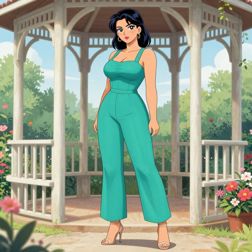 Digital anime-style drawing of a curvy woman with black hair in a turquoise jumpsuit and heels, standing in a sunlit, floral garden gazebo