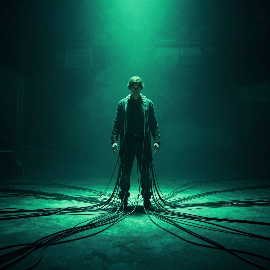 Photograph of a mysterious figure standing center stage under a green spotlight. The figure, dressed in a dark suit, has long, black cables extending from their chest and pooling on the floor. The cables create a radial pattern around them, while the background is dark and blurred, adding a sense of isolation. The green light casts an eerie glow, highlighting the cables and the figure's silhouette. The overall atmosphere is moody and enigmatic, reminiscent of a science fiction or cyberpunk theme. The image is highly stylized, emphasizing the contrast between the dark figure and the green light.