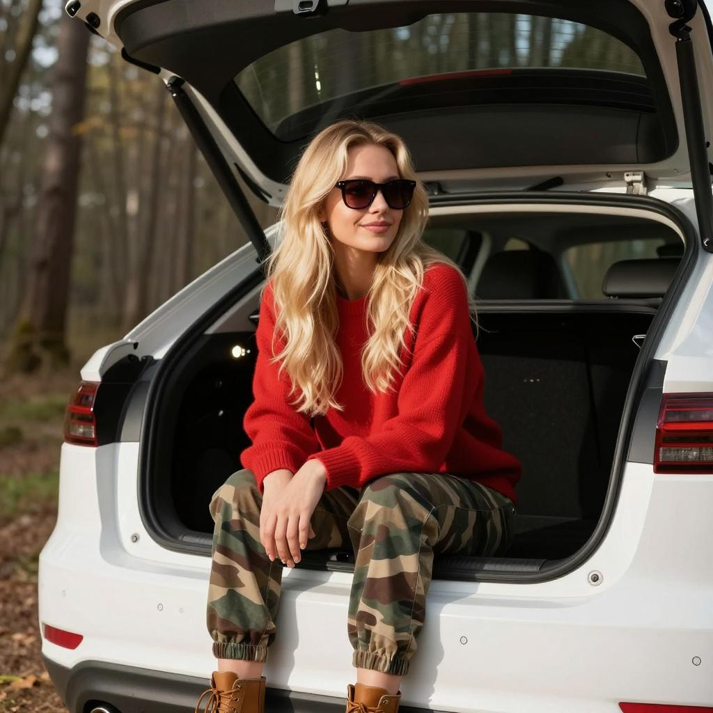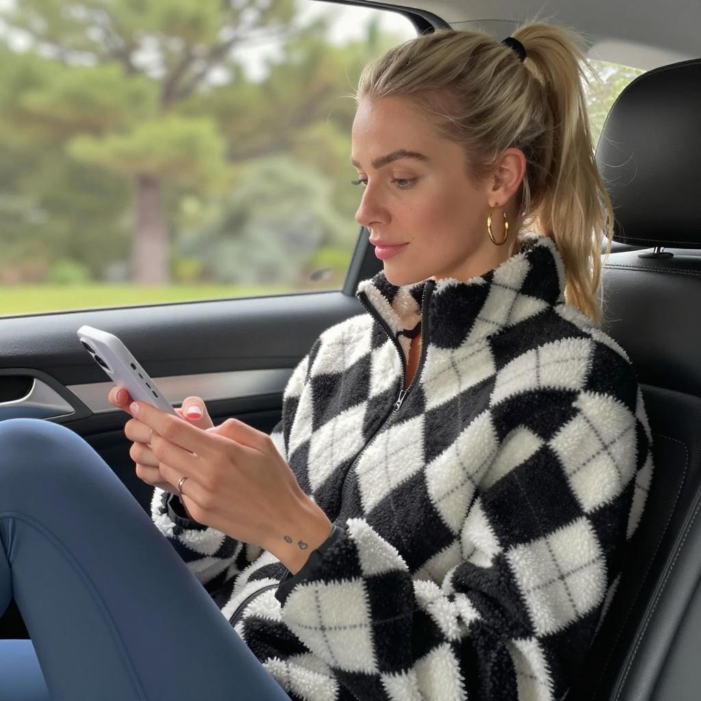 Blonde woman with light skin sitting in a car, wearing a black and white diamond-patterned fleece jacket, blue leggings, and gold hoop earrings. She has her hair tied in a high ponytail and holds a white smartphone in her right hand while looking at the screen. A small tattoo is visible on her left wrist. The car window shows a blurred background of green trees, with bright natural light illuminating the scene.