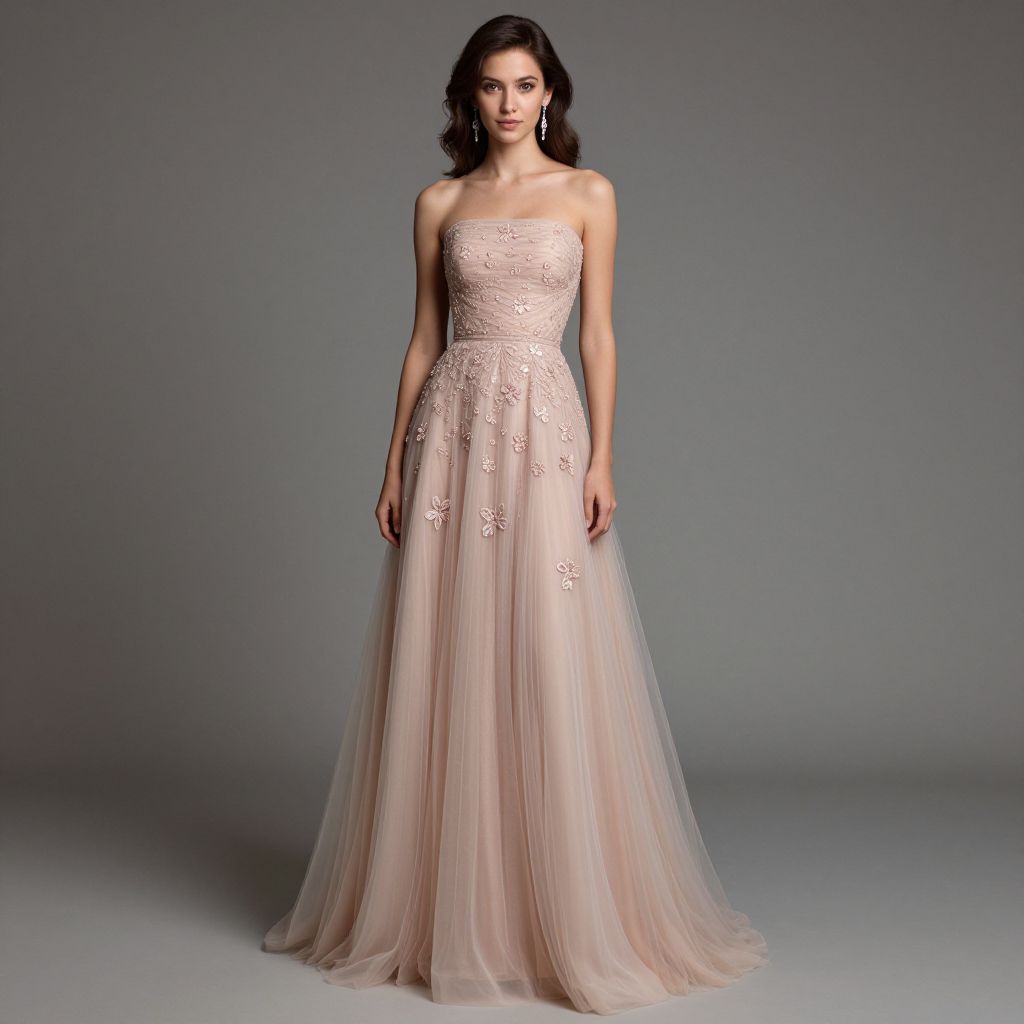 Elegant woman showcasing a strapless Elie Saab couture dress featuring a blush-pink hue, embellished bodice with intricate floral embroidery, and a flowing tulle skirt cascading gracefully to the floor, complemented by dangling earrings and softly styled hair.
