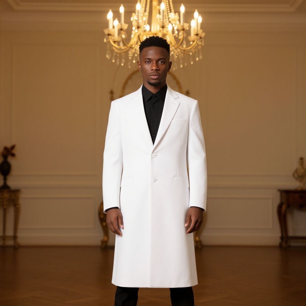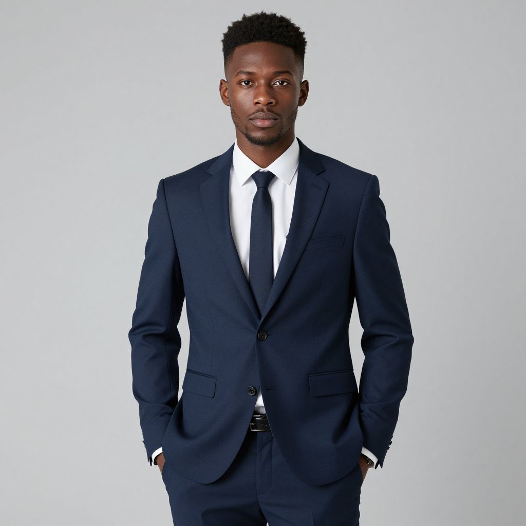 Photograph of a young Black man with short, curly black hair, standing against a plain beige background. He wears a classic black tuxedo with a white dress shirt and a black bow tie. His right hand is in his tuxedo pocket, and his left hand rests by his side. He has a serious expression and is looking directly at the camera. The tuxedo is well-fitted, and he is also wearing black gloves. The lighting is even, highlighting his dark skin tone and the crisp texture of his attire.