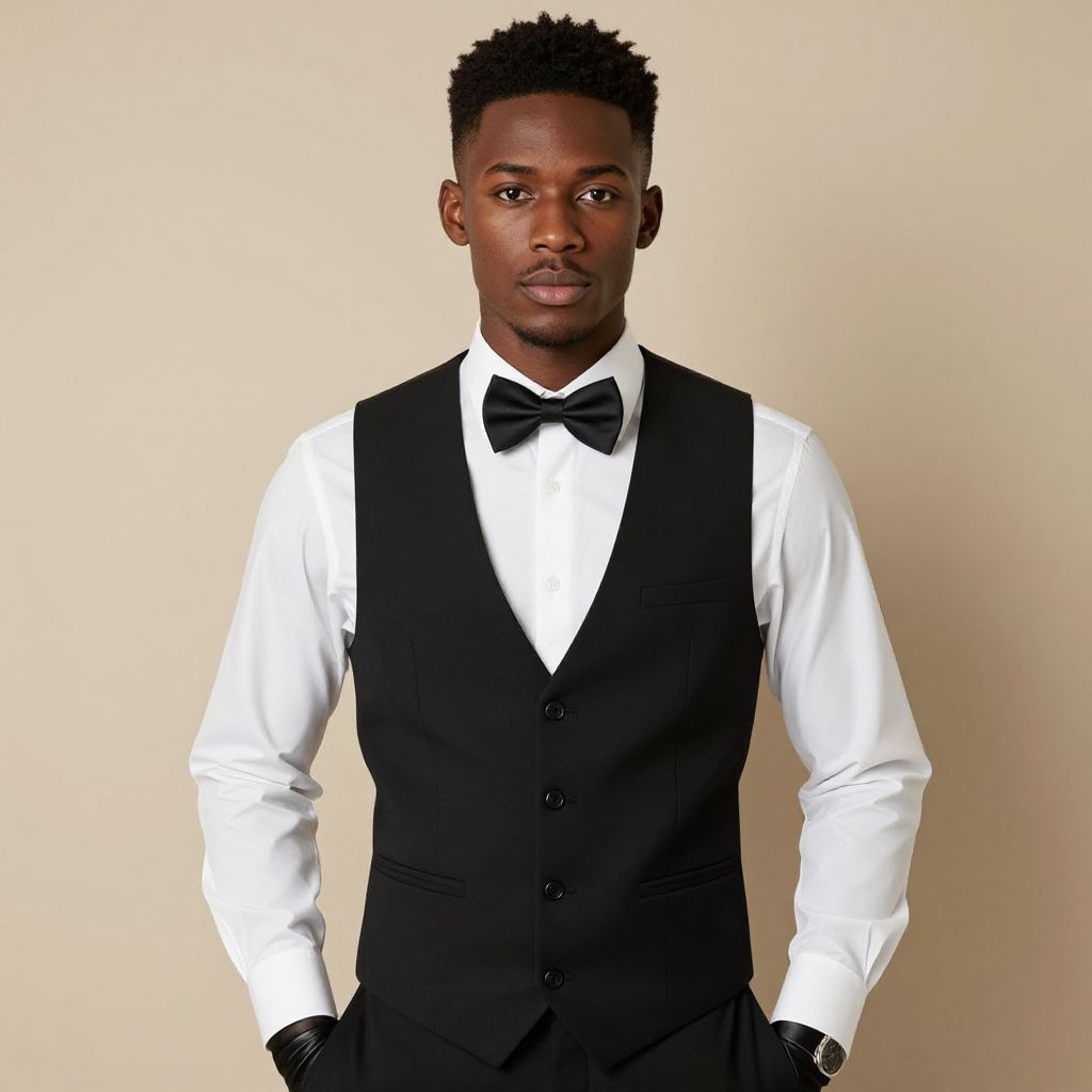 Photograph of a handsome Black man with short, curly hair, wearing a black vest, white shirt, black bow tie, and black gloves, standing