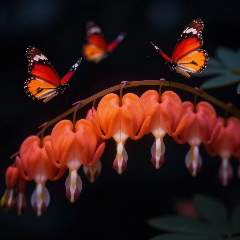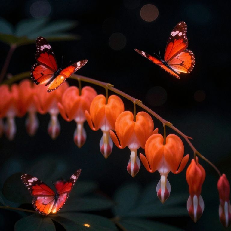 Portrait, ray tracing, highly-detailed, 8k RAW Editorial Photo, vibrant orange Bleeding Hearts flowers and glowing red butterflies against a pitch-black background Painterly, surreal, vibrant glow, bokeh, cinematic light, dramatic light, shallow depth of field, bokeh, film grain