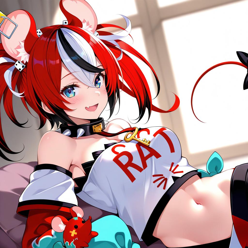 Mr. squeaks (hakos baelz), hololive, 1girl, mouse girl, mouse ears, mouse tail, animal ear fluff, sharp teeth, tail bow, blue eyes, hair between eyes, red hair, streaked hair, black hair, white hair, long hair, dice hair ornament, twintails, medium breasts, navel, white shirt, spiked collar, bare shoulders, detached sleeves, virtual youtuber, virtual youtuber, mouse (animal), midriff, key, by artist kujou ichiso, illustrious