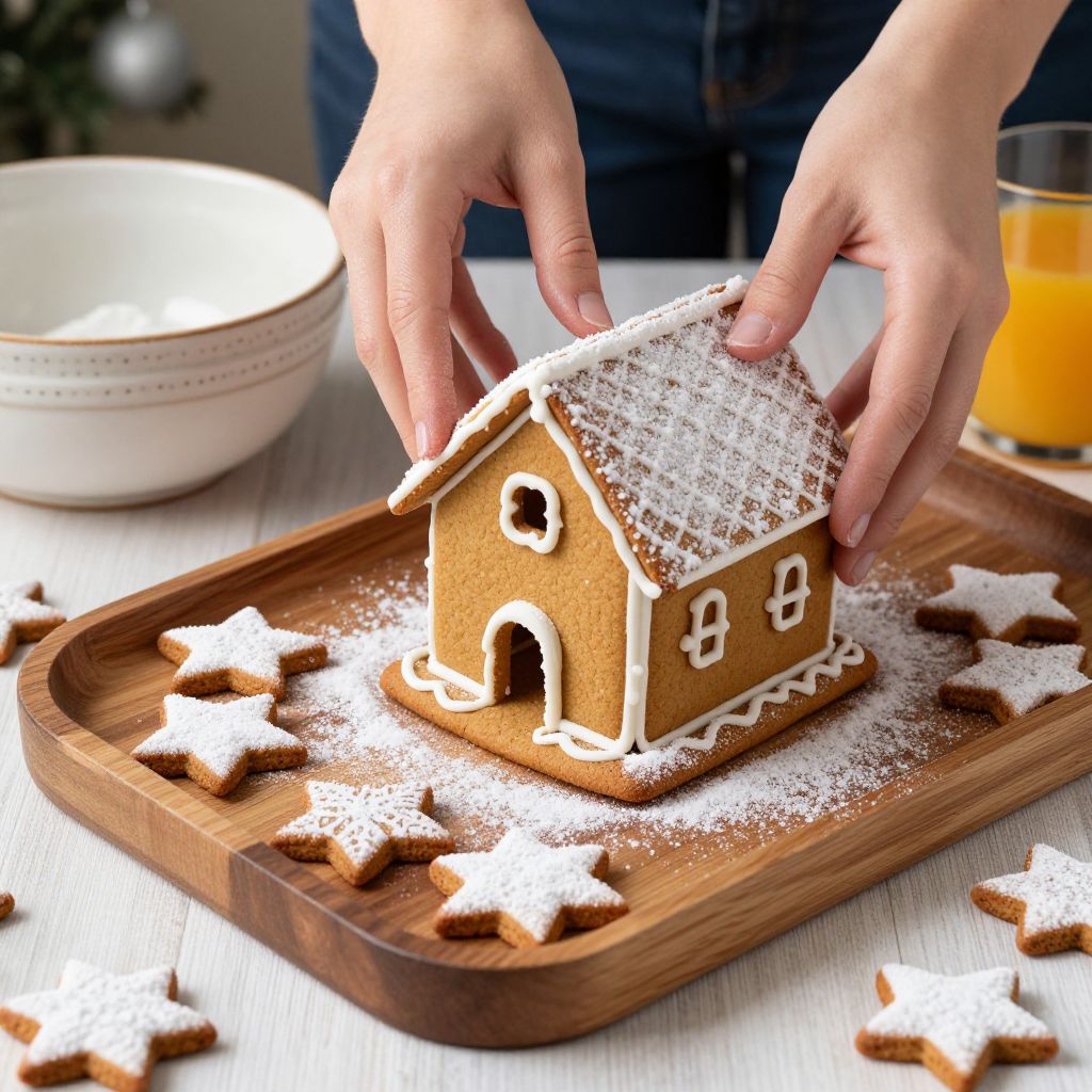 Woman's hands delicately assembling a gingerbread house on a wooden tray surrounded by festive star-shaped cookies dusted with powdered sugar, set against a cozy backdrop with a ceramic bowl and a glass of orange juice.