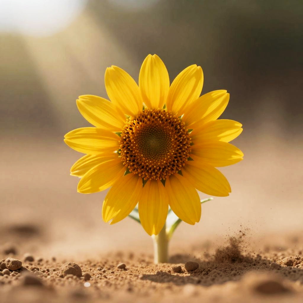 A ral-sun flying flower, dusty background, epic, heroic, bokeh, sharp detailed, hyperrealistic, amazing, macro photo, god rays