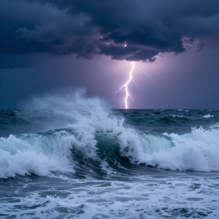 Photograph of a dramatic ocean scene at night. Dark, stormy clouds dominate the sky, with a bright, jagged lightning bolt striking down from the center. The ocean waves are turbulent, with white foam cresting against the blue, choppy water. The lightning illuminates the waves, highlighting their texture and movement. The sky is a deep purple, contrasting with the white of the lightning and foam. The overall mood is intense and dynamic, capturing the raw power of a thunderstorm over the sea.