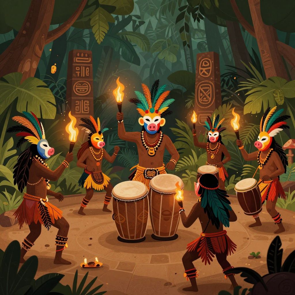 Tribual council meeting in a dense rainforest clearing, ancient wooden totems carved with intricate patterns, elders seated around a fire under fluorescent plants glowing softly, a mystical and spiritual ambiance, detailed illustration.