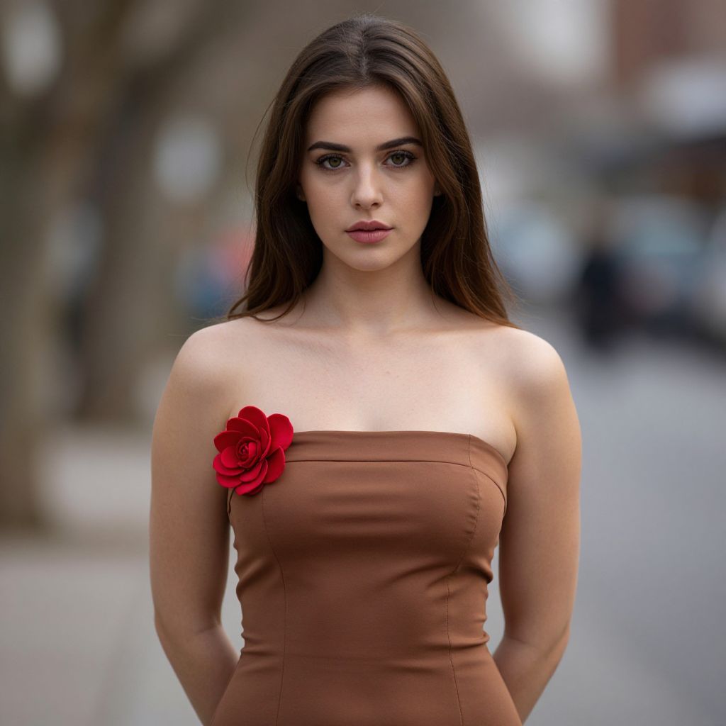 Photograph of a young woman with long, straight dark brown hair and fair skin standing outdoors on a blurred street with trees and buildings in the background. She has dark, focused eyes and is wearing a strapless, form-fitting brown dress with a vibrant red rose on the left side of her chest. Her arms are behind her back, and she has a neutral, slightly serious expression. The image has a shallow depth of field, making her the clear focal point. The lighting is natural, and the overall style is modern and elegant.