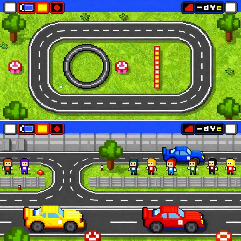 2d racing games inspired by 90s arcade aesthetics, blocky pixel environments, multiple racing tracks with obstacles, lively crowds, bright and bold color palette