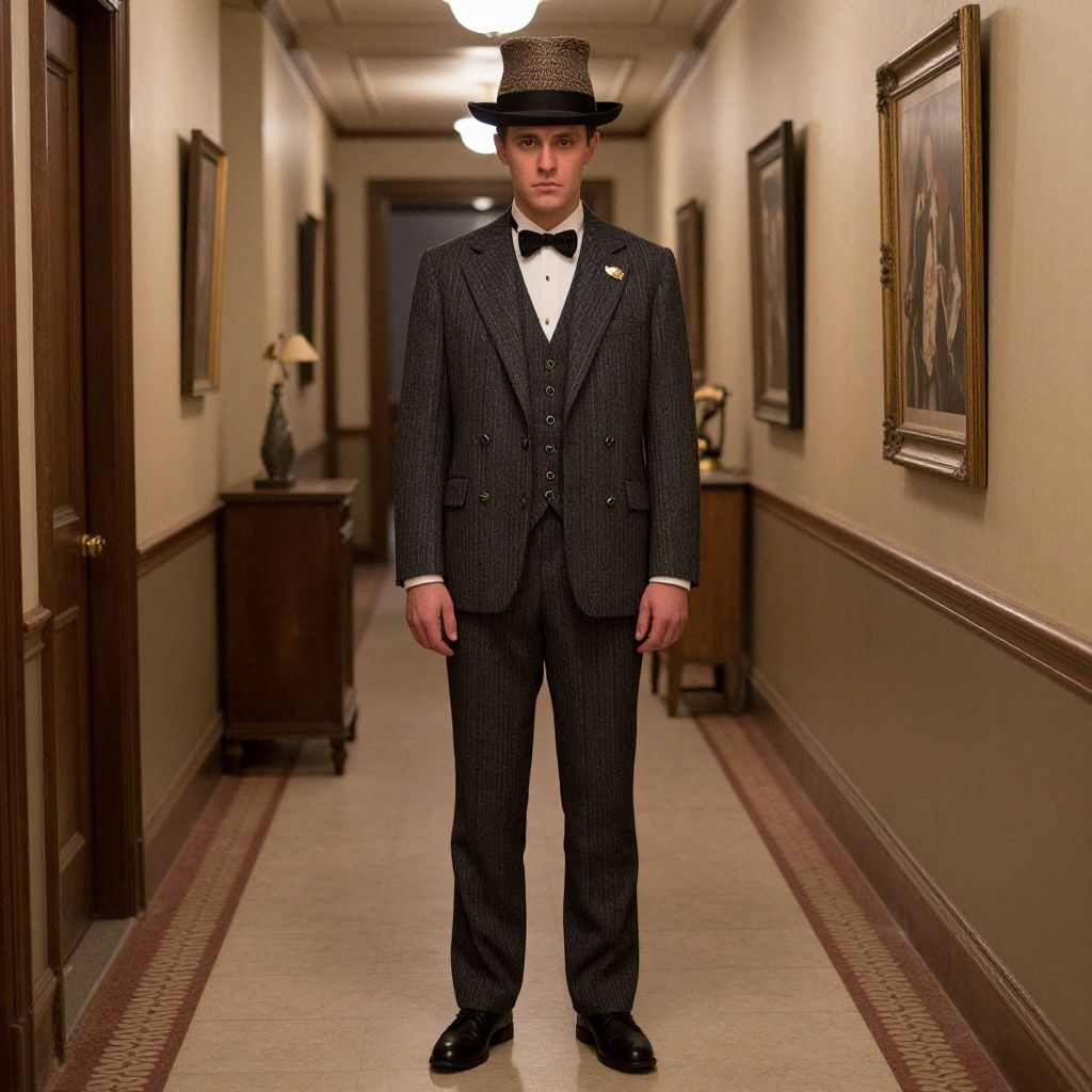 Great Gatsby Theme Costume, man in a suit and hat standing in a hallway