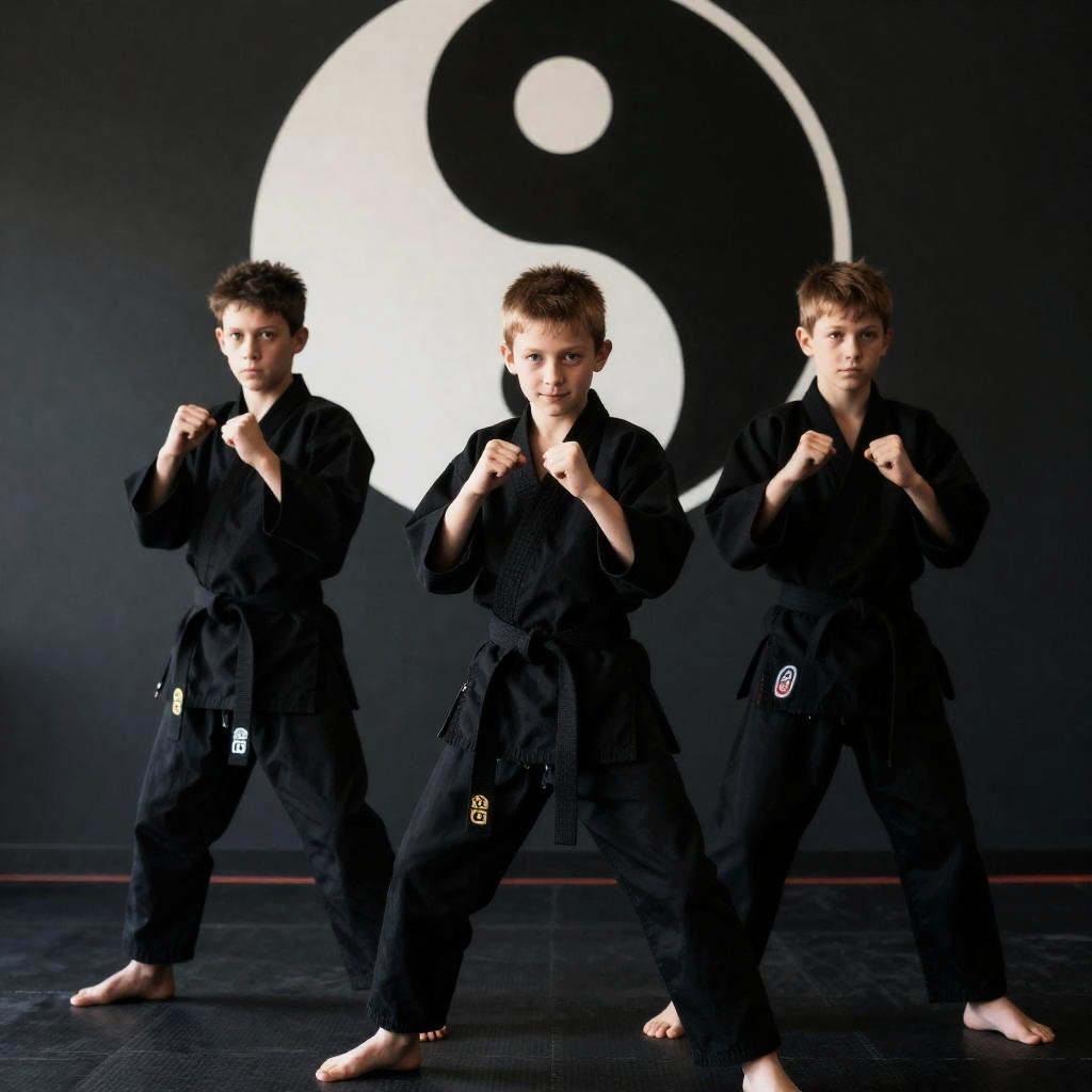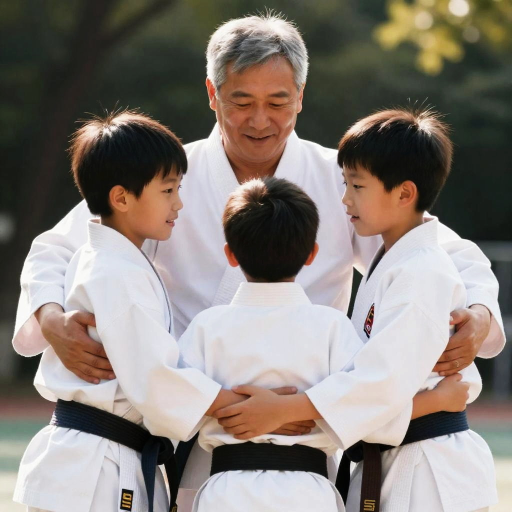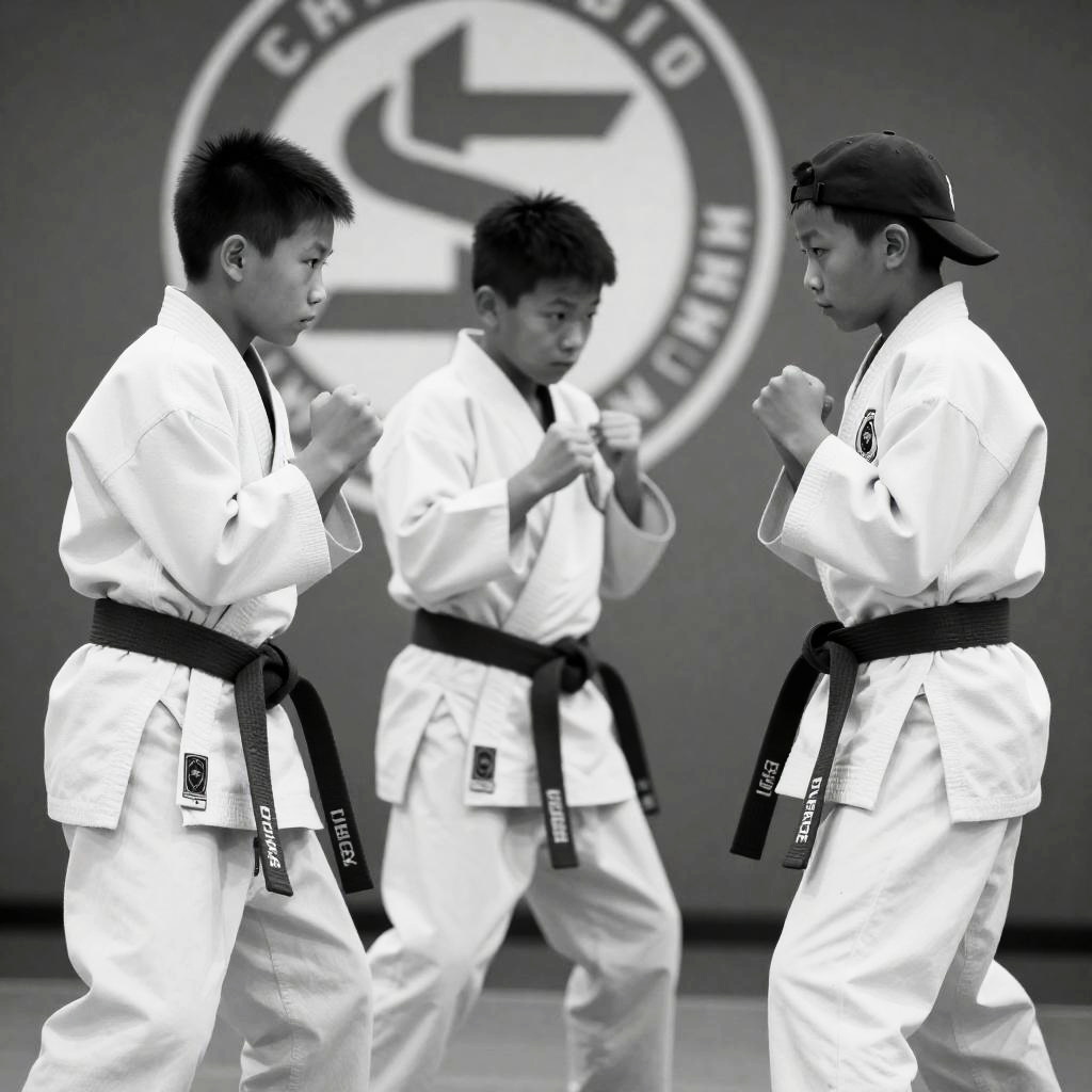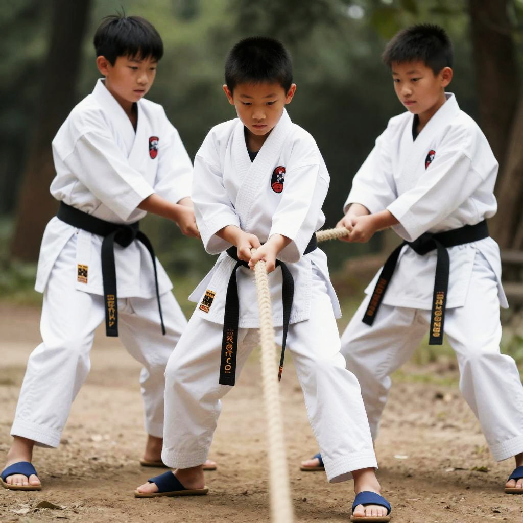 Three young Asian boys in white karate uniforms with black belts pull a rope, forcing the central boy to bend forward. Forest background. Boys have short black hair, focused expressions. Rope taut, dirt path underfoot.