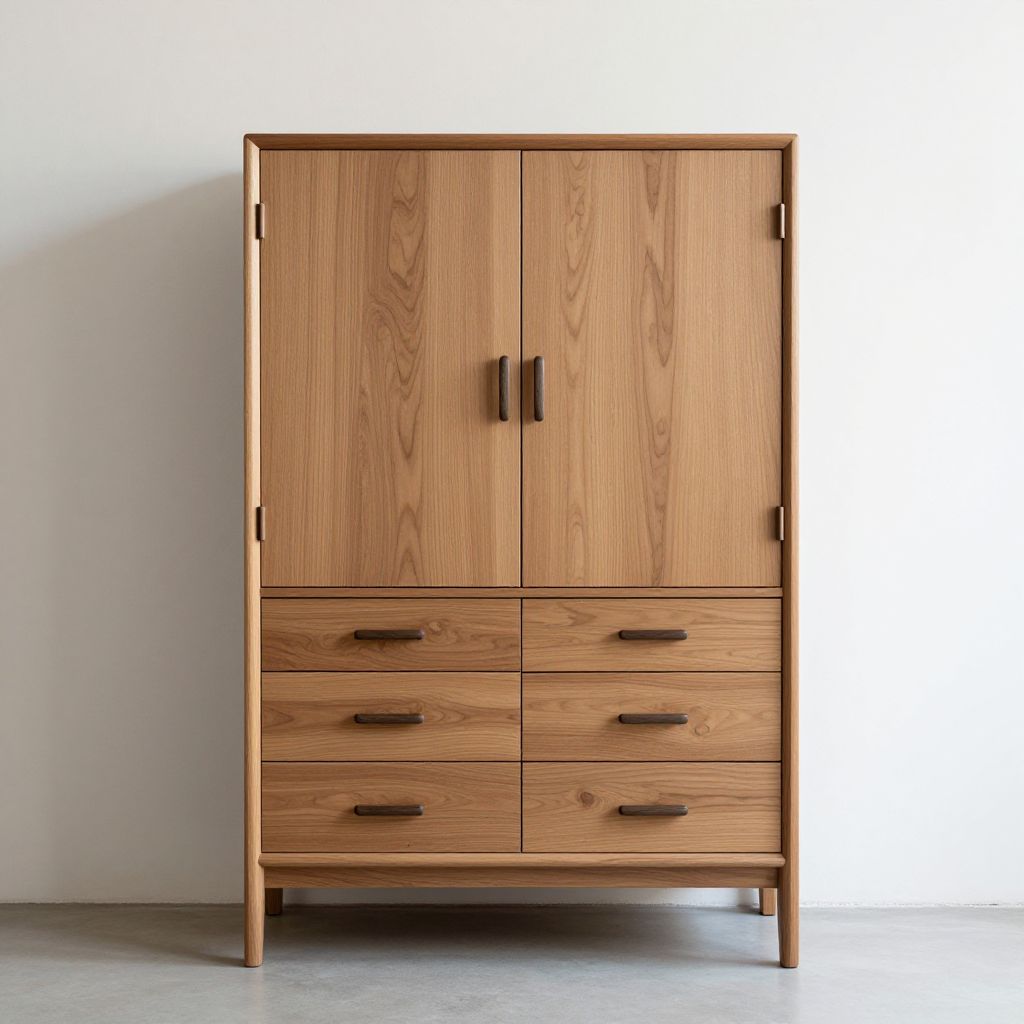 Photograph of a mid-century modern wooden cabinet with a natural oak finish. The cabinet has a simple, rectangular shape and stands on four short legs. It features two large doors in the upper half, each with a vertical black metal handle, and four drawers in the lower half, each with a horizontal black metal handle. The wood grain is visible, adding texture and warmth. The background is a plain white wall, and the floor is a light gray concrete. The overall style is minimalist and functional, emphasizing clean lines and natural materials.