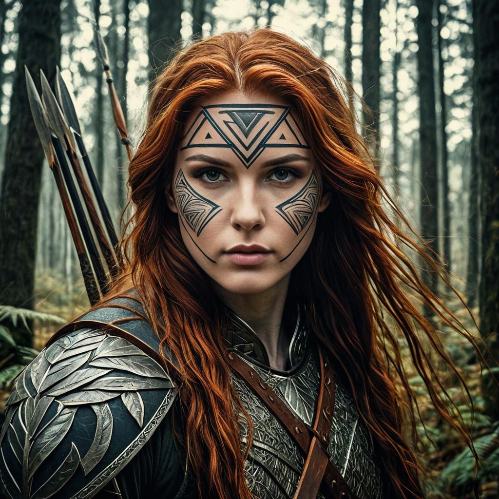 Forest guardian, protective, long auburn hair intertwined with leaves, serene weathered face, warm hazel eyes, confident gaze, muscular but nimble frame, standing firm with spear. Art style inspired by Geoffroy Thoorens, Aaron Horkey. Stunning depth, double exposure effect, surreal elements, geometric patterns, and intricate detailing. Bokeh, finely balanced with deep borders. Artistic photorealism, smooth texture, and masterful execution.