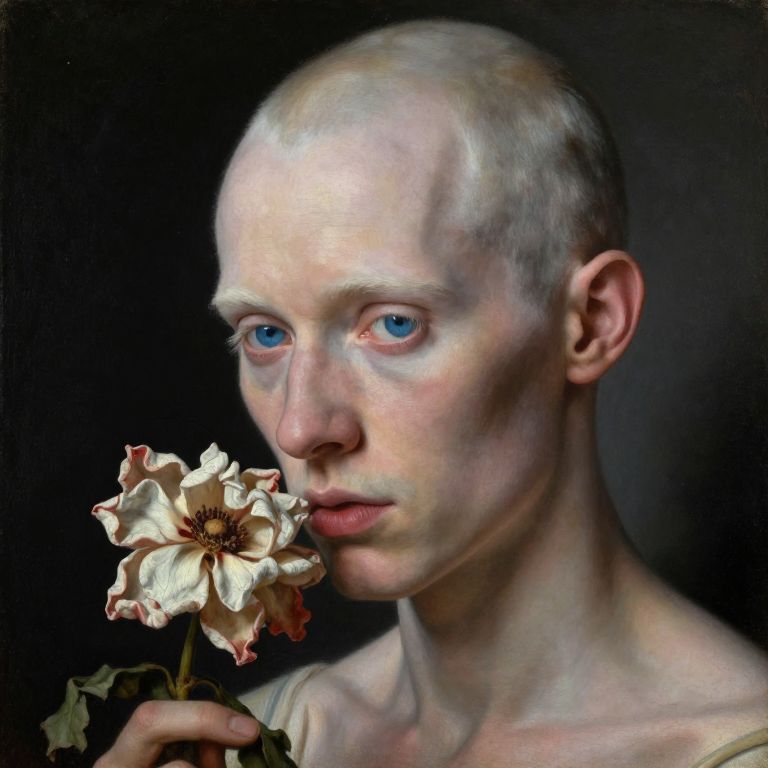 Photorealistic digital painting of a bald, pale-skinned person with blue eyes, holding a white, slightly wilted flower against a dark background.