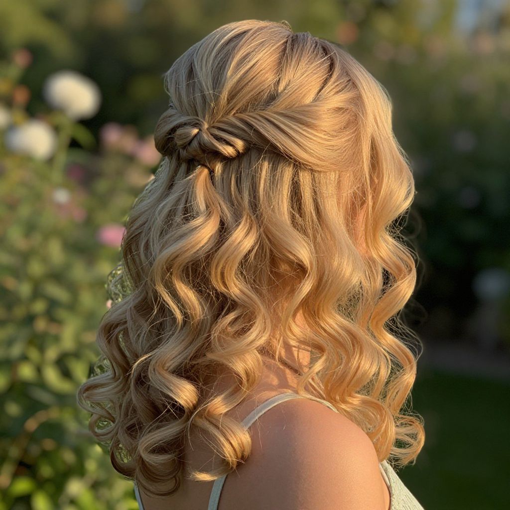 Photograph of a blonde woman with wavy, shoulder-length hair styled in loose curls. Her hair is partially braided at the top, forming a small bun. She wears a light-colored, sleeveless top. The background is a blurred garden with green foliage and pink and white flowers, bathed in warm sunlight. The focus is on her hairstyle, highlighting the golden tones and texture of her hair against the soft, natural backdrop. The image has a serene, summery feel.