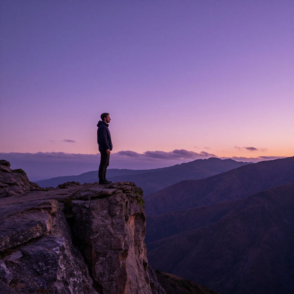 Photograph of a lone man standing on a rocky cliff at sunset. He wears a dark jacket and pants, silhouetted against a stunning purple and pink sky. The cliff's rough texture contrasts with the smooth gradient of the sunset. Below, layers of dark, forested mountains stretch into the distance, fading into the horizon. The man looks to the right, his profile illuminated by the soft, fading light of dusk. The overall mood is serene and contemplative, highlighting the vastness and beauty of nature.