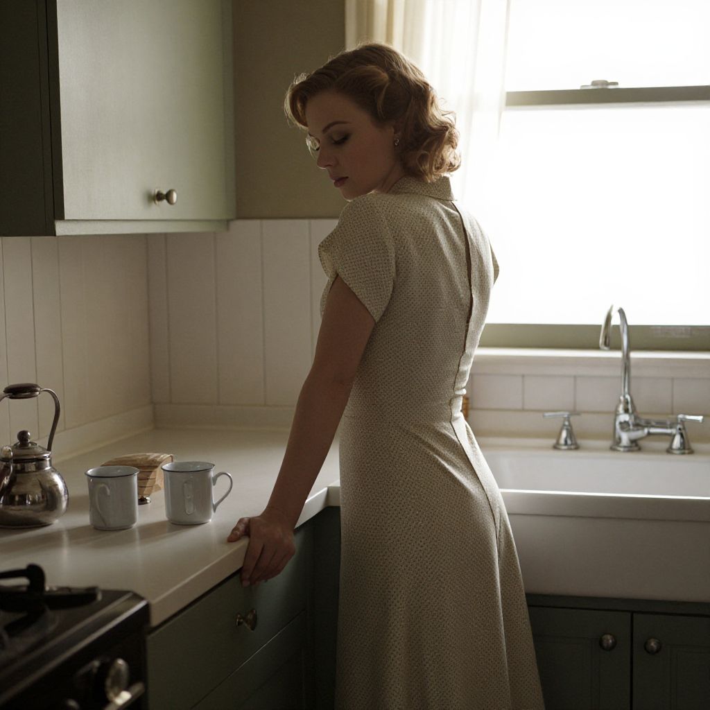 Woman in a 1930s-style dress stands contemplatively in a vintage kitchen, her back turned to the viewer as she leans against a countertop with two mugs and a coffee pot nearby, while natural light streams through a window above a sink.