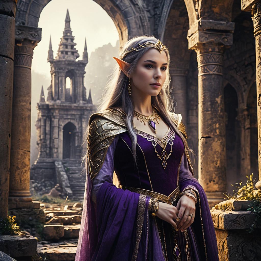 Award-winning digital portrait of a stoic elderly elven ranger in an ancient ruined stone temple at dawn, holding an ornate bow carved with elven runes, long braided peach hair with blossom accents, intricate bloom effects, cinematic golden hour lighting, highly detailed octane render concept art by Ruan Jia and Greg Rutkowski, masterpiece, sharp focus