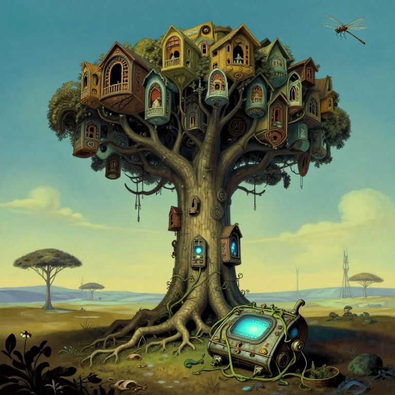 Craft an image reminiscent of surrealist comic book illustrations, portraying a bird's-eye view from a diminutive creature moving beneath a colossal tower stretching across the sky. In place of traditional clock hands, this tower boasts enormous gears and sprockets, with fantastical beings ensnared within their complex workings, eliciting both fascination and apprehension. This scene captures the lively interplay of light and darkness cast upon the ground below, where an ensemble of peculiar characters traverse a world adorned with vivid hues, distinct lines, and exaggerated features that blend levity with tension, establishing an emotional spectrum that entices viewers to delve into the multifaceted realms of this extraordinary dreamscape.