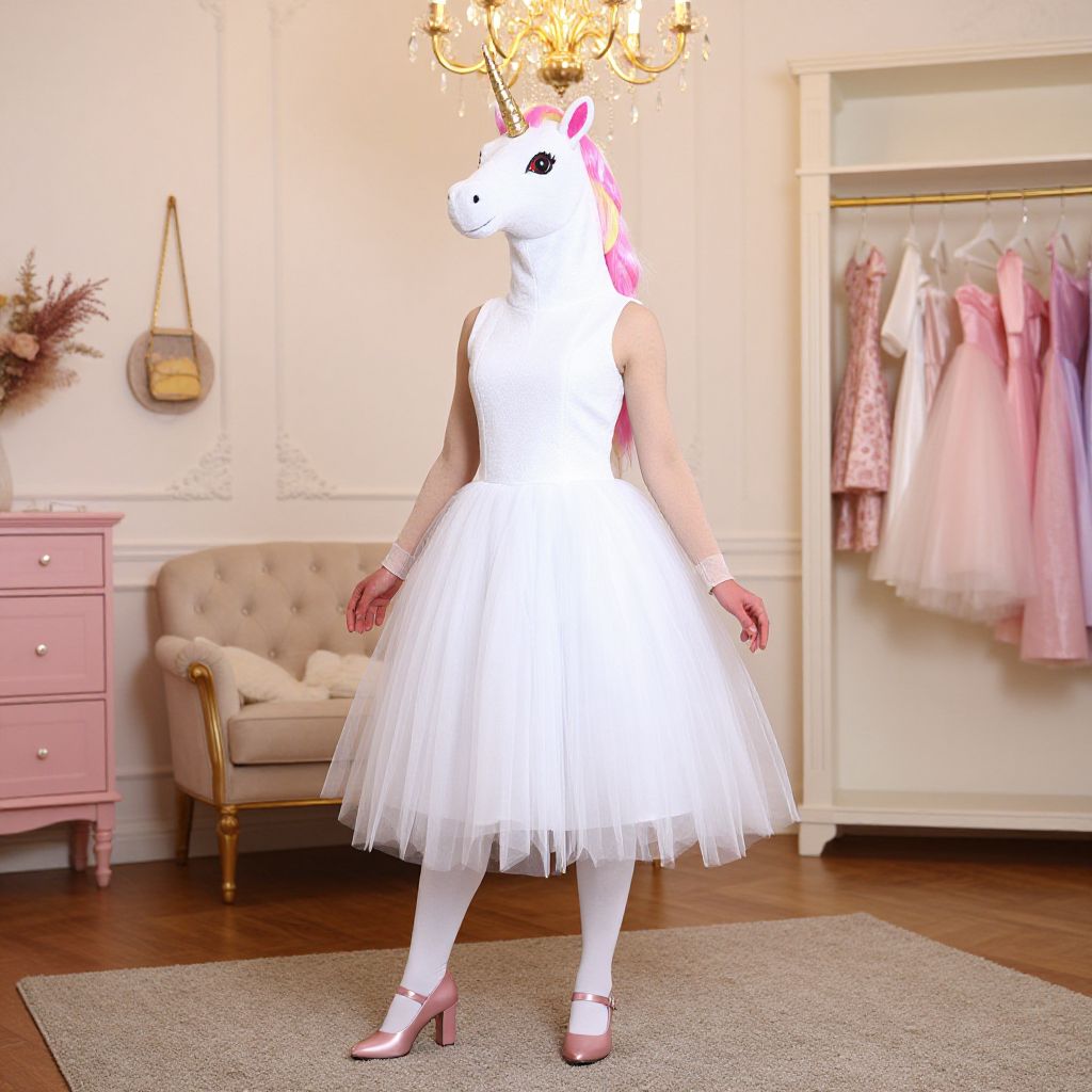 Photograph of a person wearing a white, full-skirted tulle dress with pink shoes, white stockings, and a unicorn head mask with pink mane. The background features a pink dresser with a vase of flowers, a beige tufted chair, a white wardrobe with pink and white dresses, and a chandelier with warm lighting. The room has white walls with decorative molding and a wooden floor with a beige rug. The overall style is whimsical and feminine.