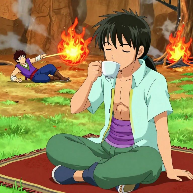 Anime-style drawing of a black-haired, shirtless man with green pants, sipping tea, while another character sets fire to the background.