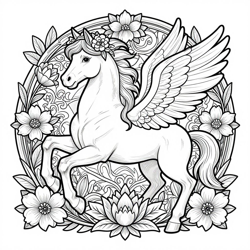 The image is a detailed, black-and-white line drawing on a white background, reminiscent of a coloring book design. The artwork features a pegasus, a mythical winged horse, with a delicate, flowing mane and a majestic, regal presence. The pegasus is adorned with a crown of flowers, adding a touch of elegance and nature to its appearance. Surrounding the pegasus are intricate floral patterns and leaves, creating a harmonious and balanced composition. The lines are thick and precise, capturing the essence of the subject with a sense of art nouveau influence, evoking the style of artist James Jean. The overall design is symmetrical and balanced, with the pegasus centrally positioned, drawing the viewer's eye to its detailed features and the surrounding floral elements. The interplay of the pegasus's wings and mane with the floral patterns creates a sense of movement and life, making the image both visually striking and emotionally engaging.