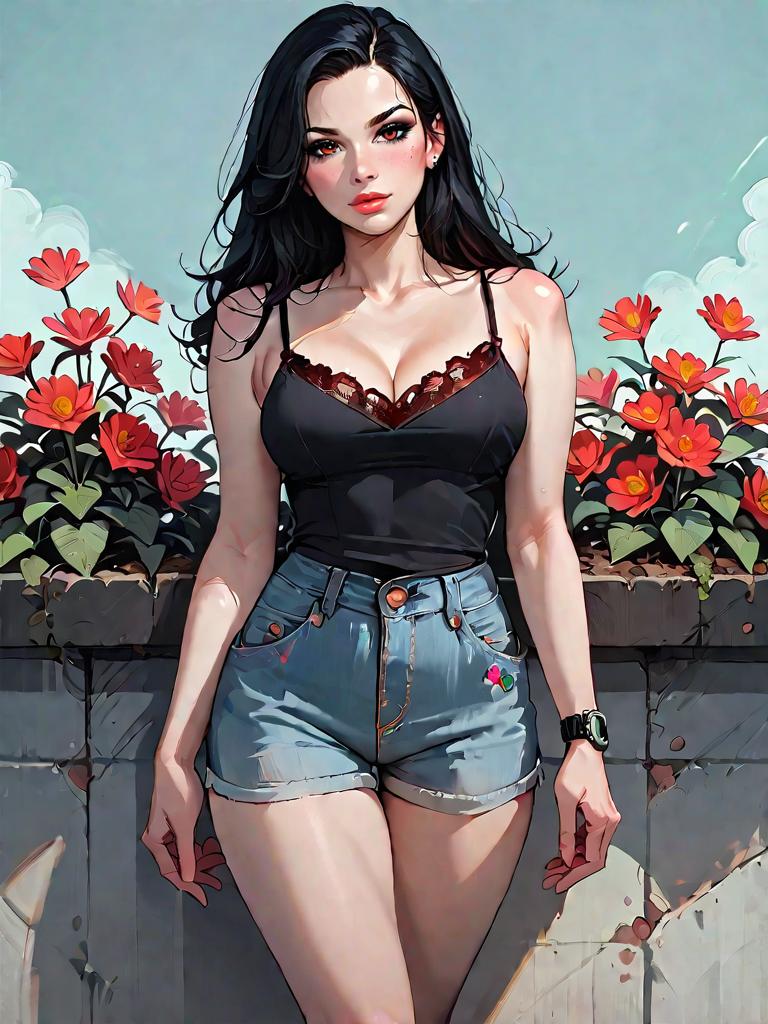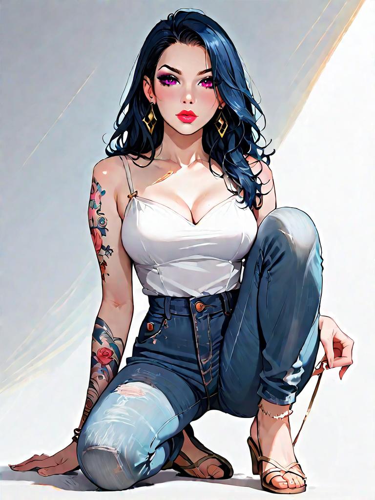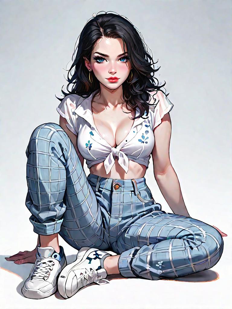 Digital artwork of a young woman with long wavy dark hair depicted in a contemporary fashion style. She is wearing a white cropped top with thin shoulder straps featuring floral embroidery and a central zipper. Her high-waisted fitted jeans also have a floral print and distressed details. The background is soft pastel blue with a pink circular gradient and floral elements, giving a modern studio vibe.