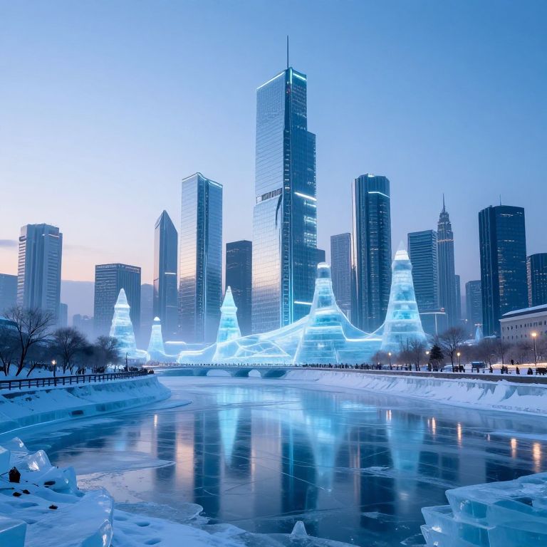 Icenraat futuristic ice cityscape at dusk, skyscrapers made of translucent ice and metal, reflections on frozen rivers, neon blue lighting contrasting the snowy environment, blending sci-fi with fantasy elements.