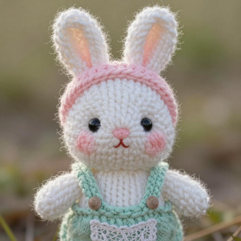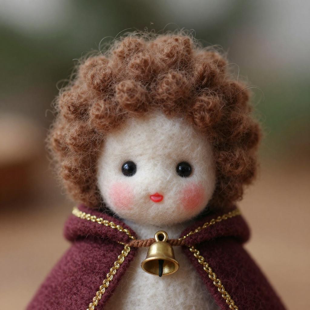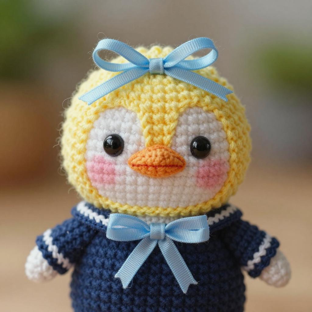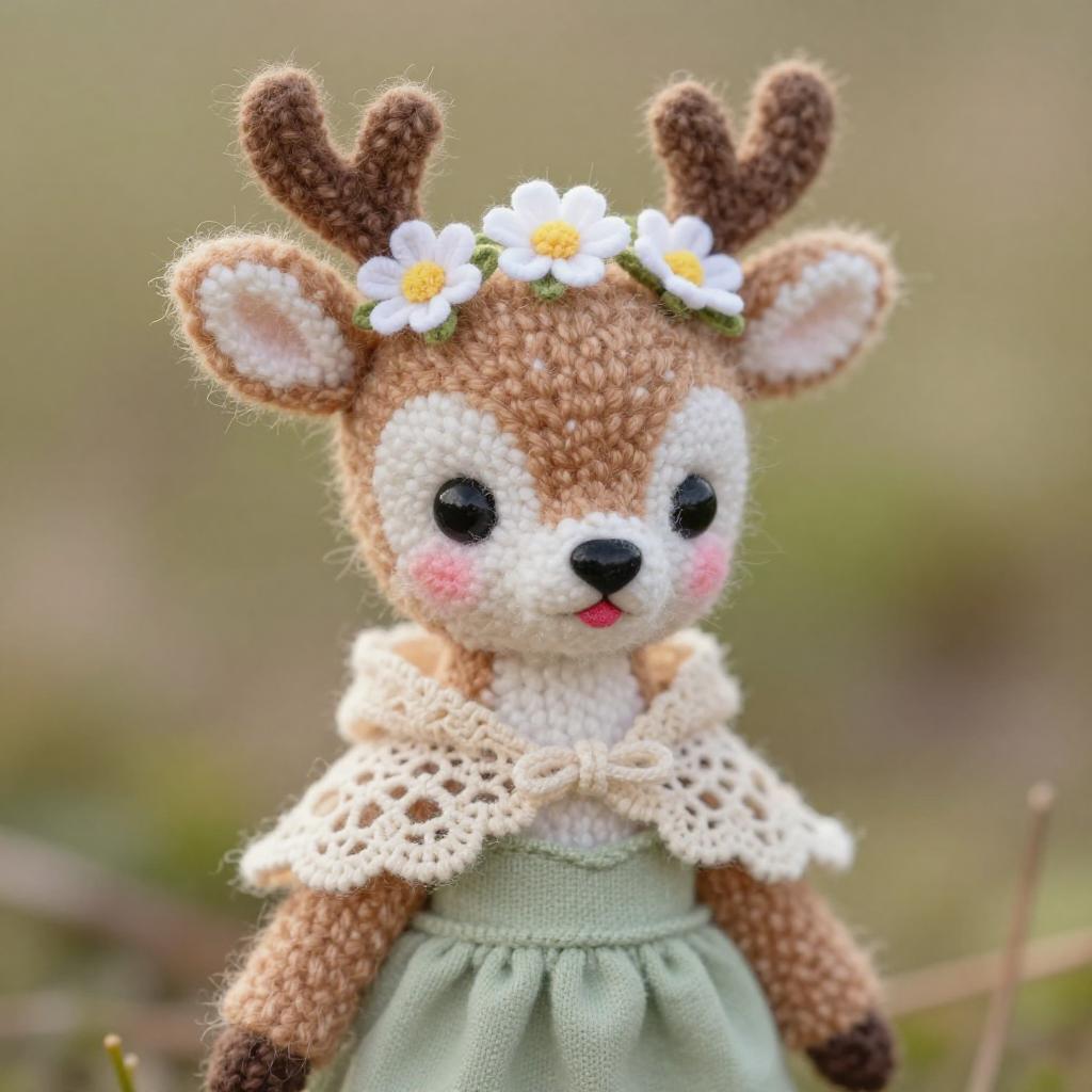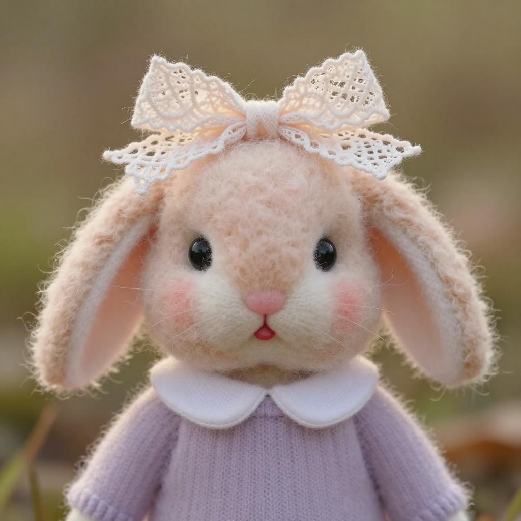 Macro close-up portrait of a amigurumi mouse, featuring fine silver yarn fur with a dainty blue satin bow. The face is porcelain white with large black eyes, soft pink cheeks, and red lips, wearing cream jumper dress with pastel yellow polka dots. Background melts into creamy bokeh of muted greens and earthy browns, making the subject stand out. Natural warm light, shallow depth of field, crisp fiber texture, festive craft aesthetic.