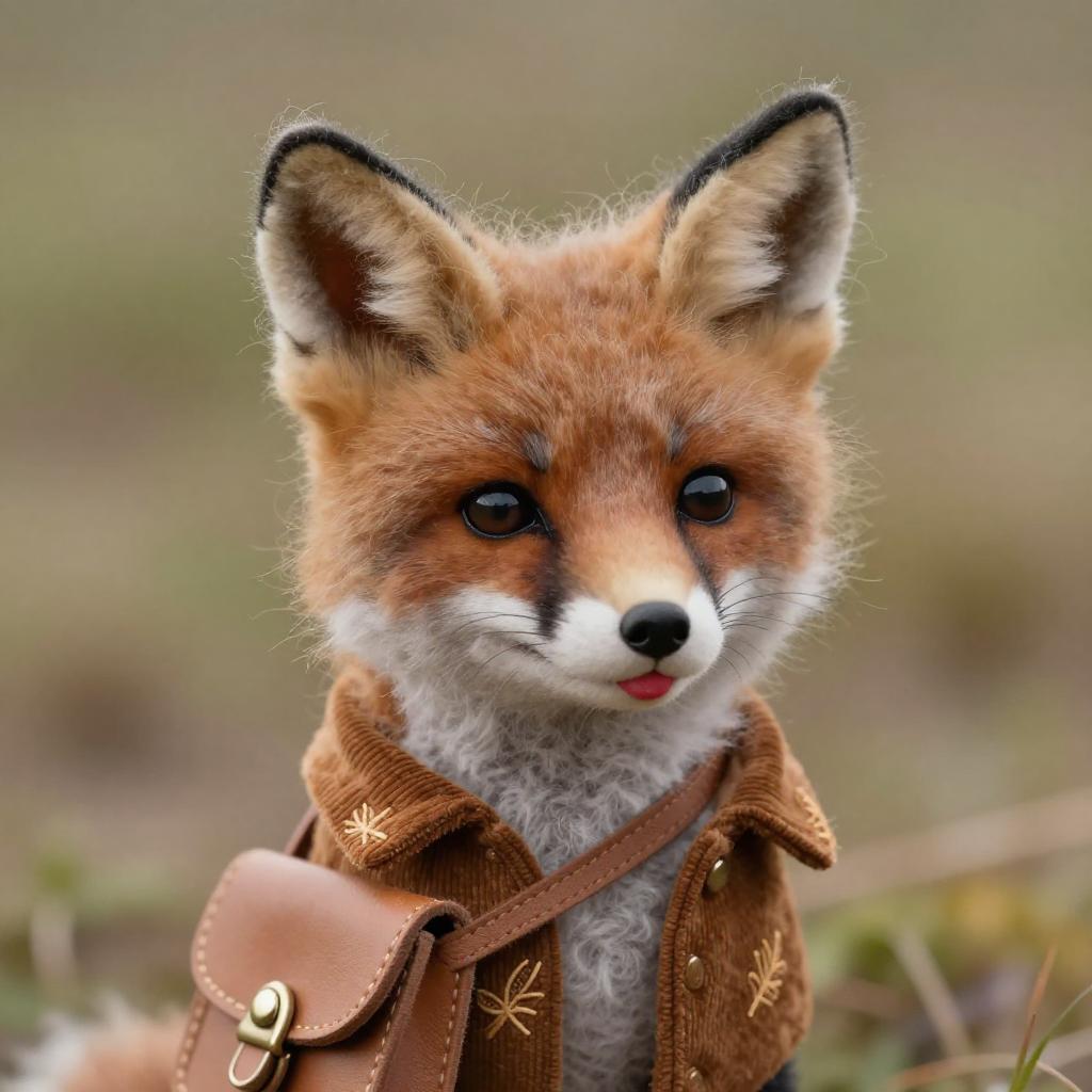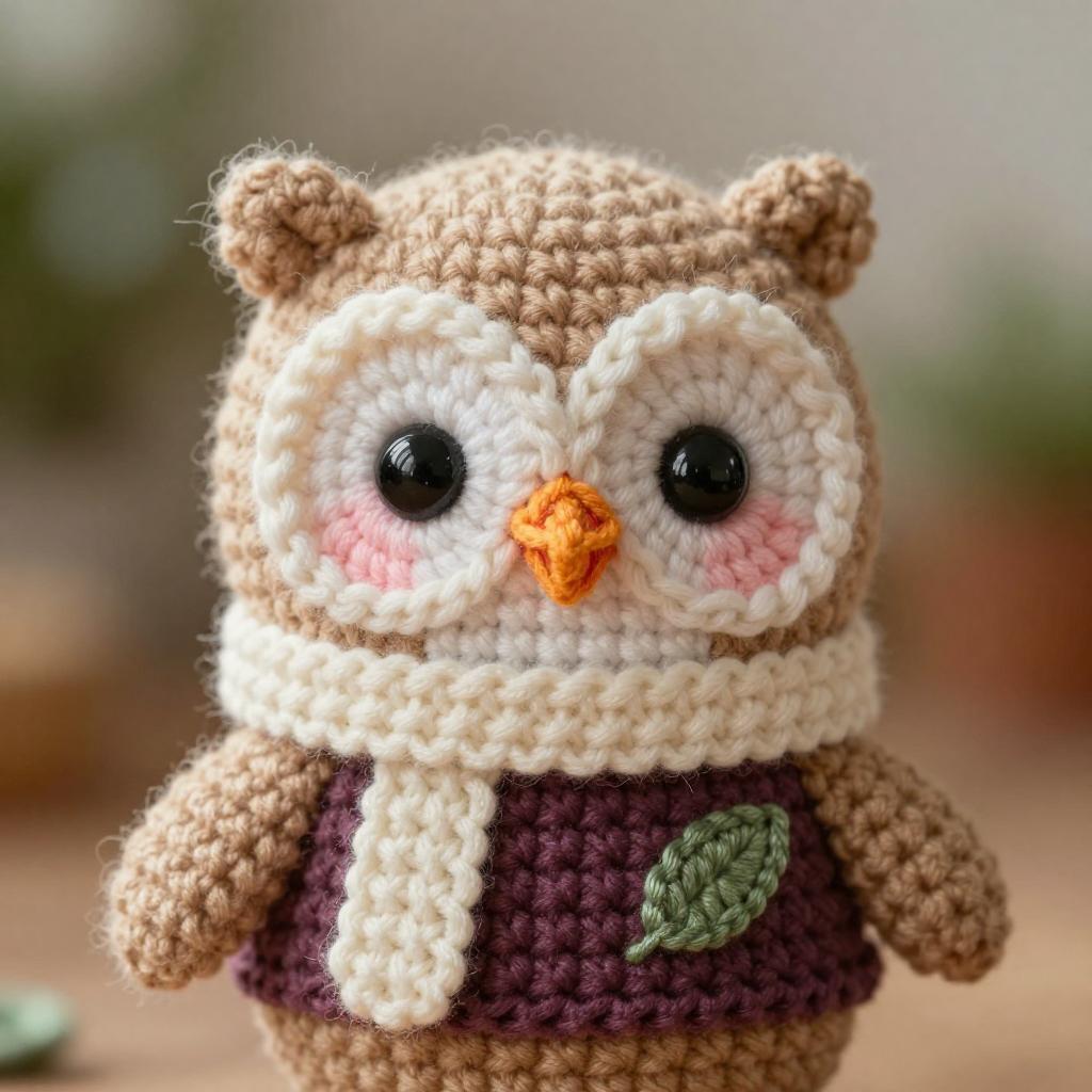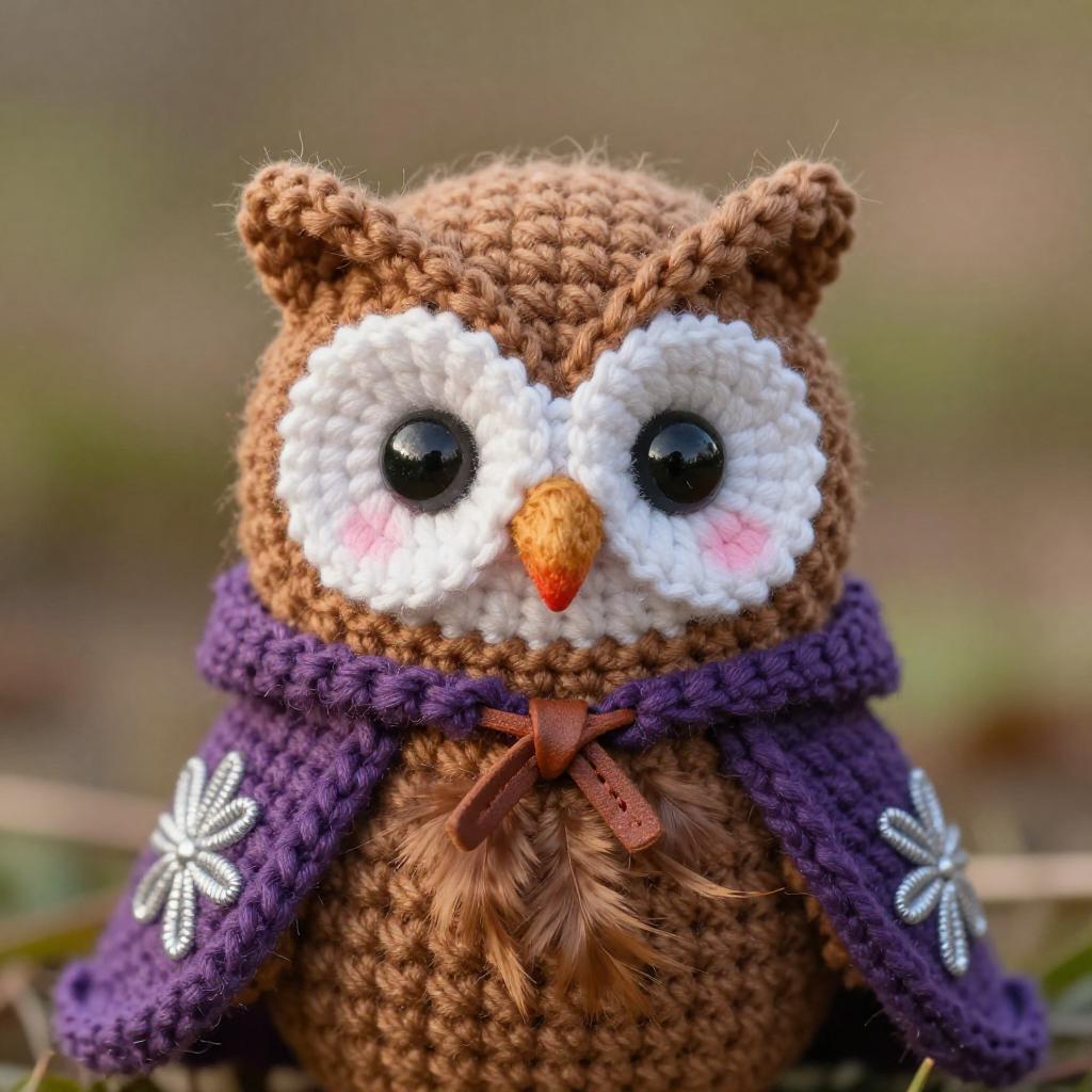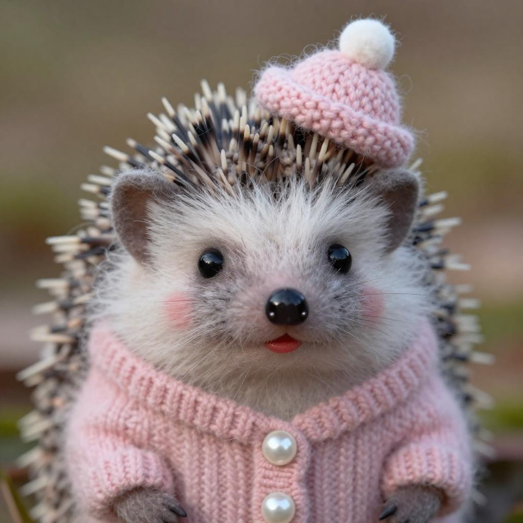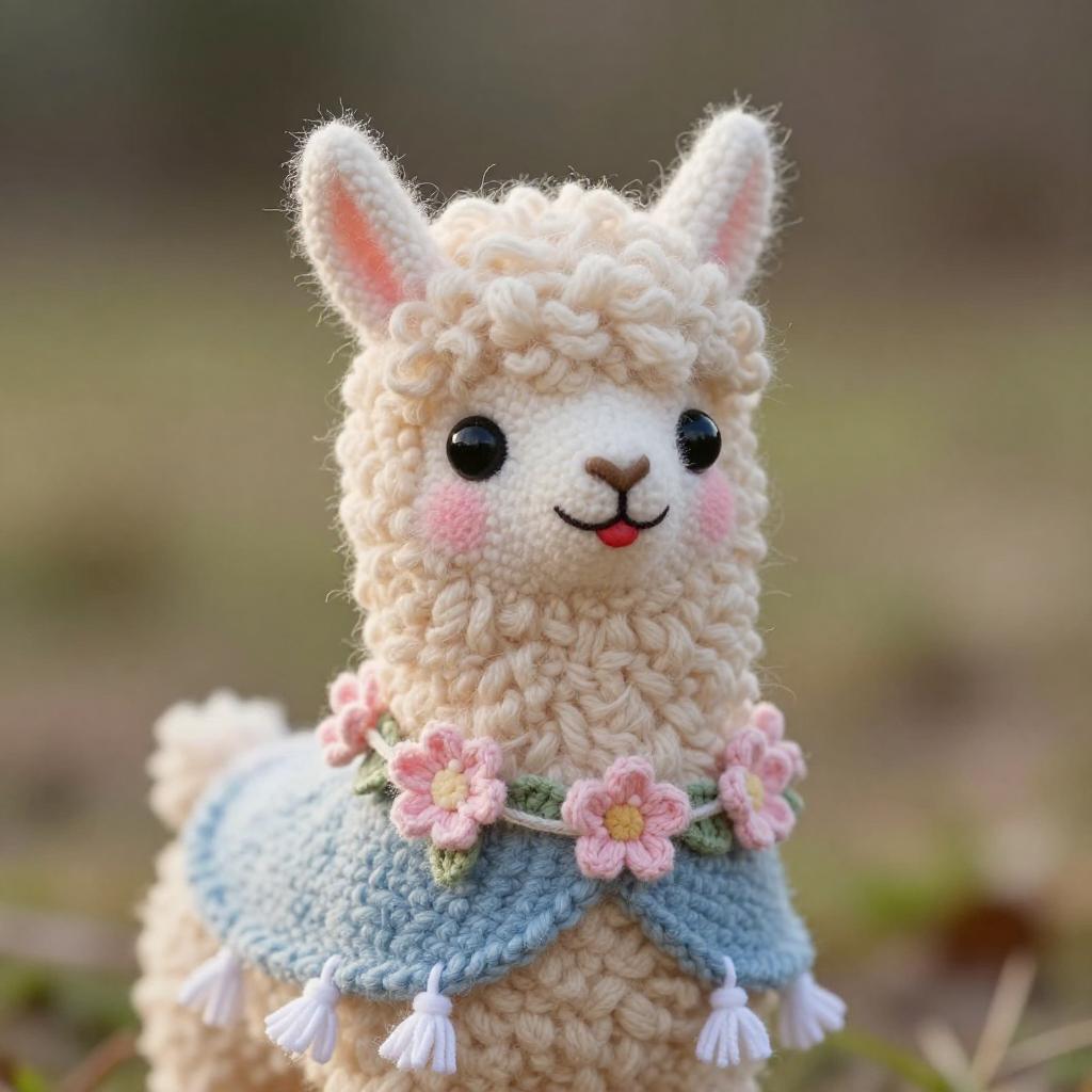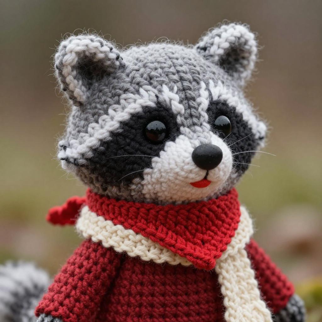 Macro close-up portrait of a amigurumi mouse, featuring fine silver yarn fur with a dainty blue satin bow. The face is porcelain white with large black eyes, soft pink cheeks, and red lips, wearing cream jumper dress with pastel yellow polka dots. Background melts into creamy bokeh of muted greens and earthy browns, making the subject stand out. Natural warm light, shallow depth of field, crisp fiber texture, festive craft aesthetic.