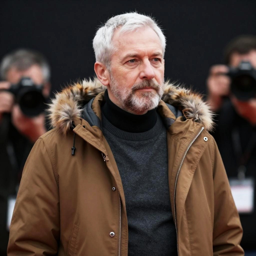 Middle-aged man with short white hair and gray beard, wearing a brown parka with fur hood, black turtleneck, and gray sweater. Neutral expression, looking slightly to the right. Dark background. Photographer's light illuminates face and upper body.