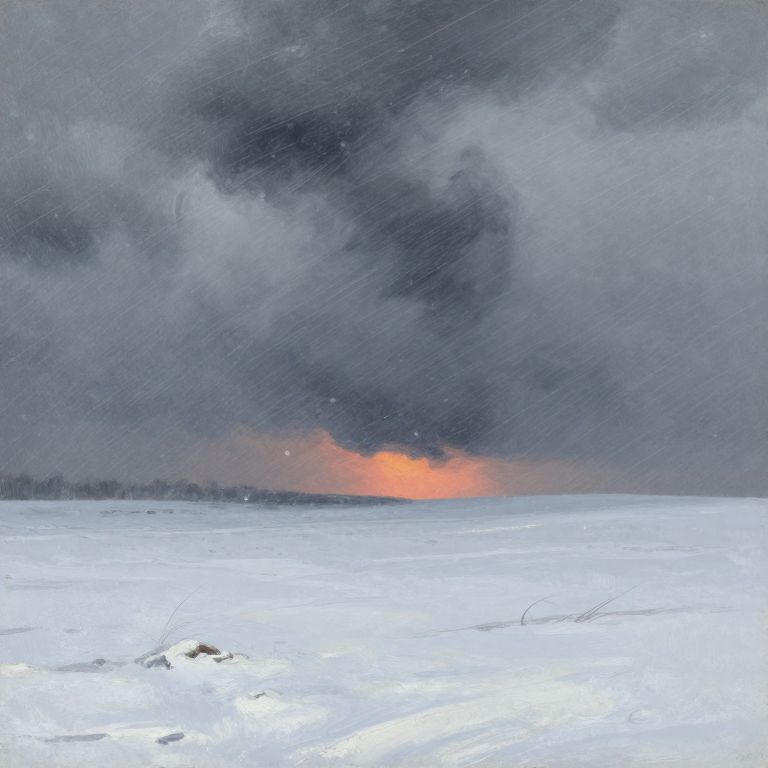 Illustration, style of Laurent Grasso, style of Andreas Achenbach, “Vast, snow-covered plain under a fierce blizzard, swirling snowflakes, howling wind, dark clouds, sunset, desolate landscape, muted colors, dramatic atmosphere, oil painting, textured brushstrokes, moody lighting, ethereal quality