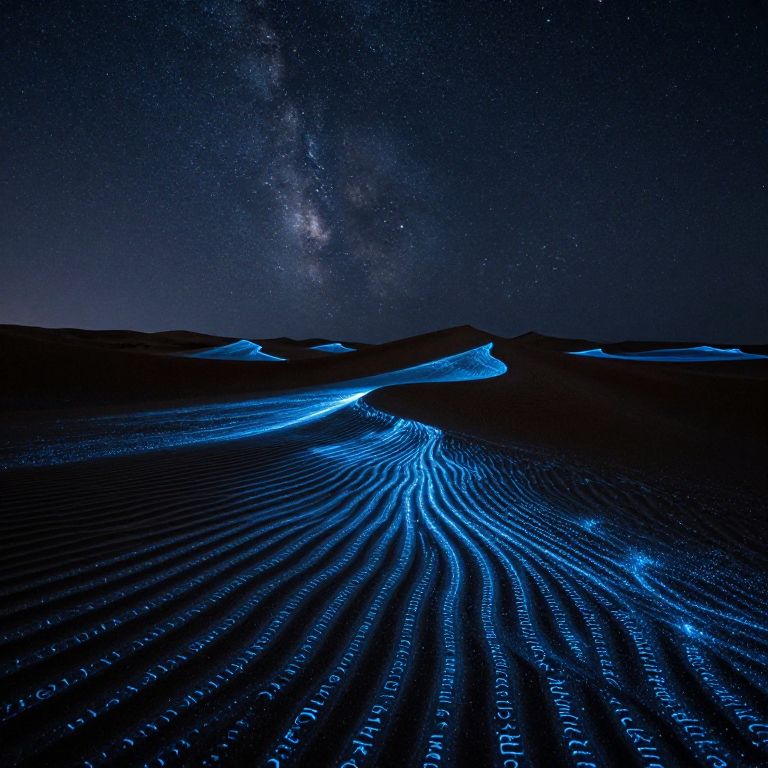 Under a starlit desert sky, bioluminescent dunes ripple with ethereal light, their sands weaving intricate patterns that shimmer like forgotten scripts, only to dissolve into silence with the dawn.