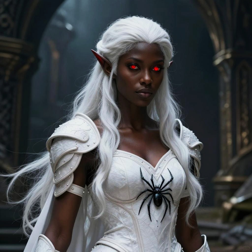 Portrait of a female drow fantasy character with ebony skin, long flowing white hair, and glowing red eyes. She is wearing detailed white armor adorned with spider motifs, set against a dark, mysterious underground city background. The lighting emphasizes her sharp facial features, capturing a fantasy realism style with dark magic ambiance.